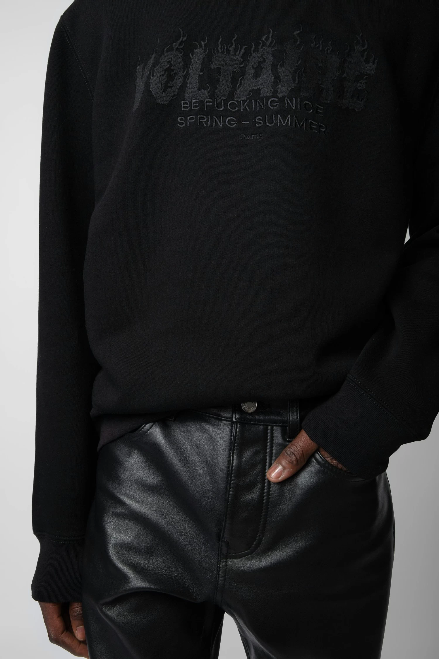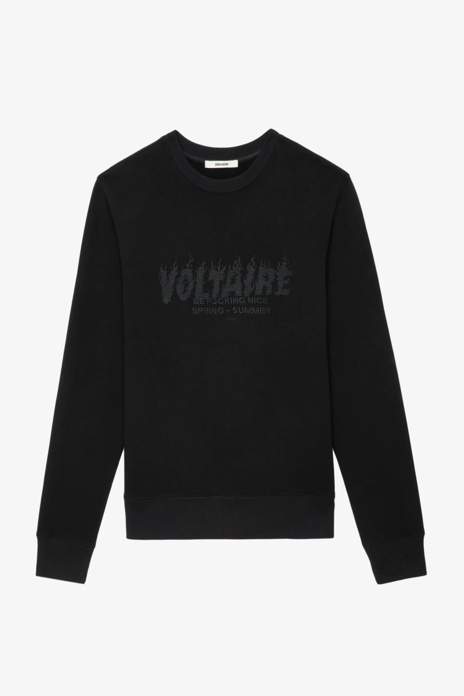 Men’s cotton sweatshirt with “Voltaire” embroidery on front.