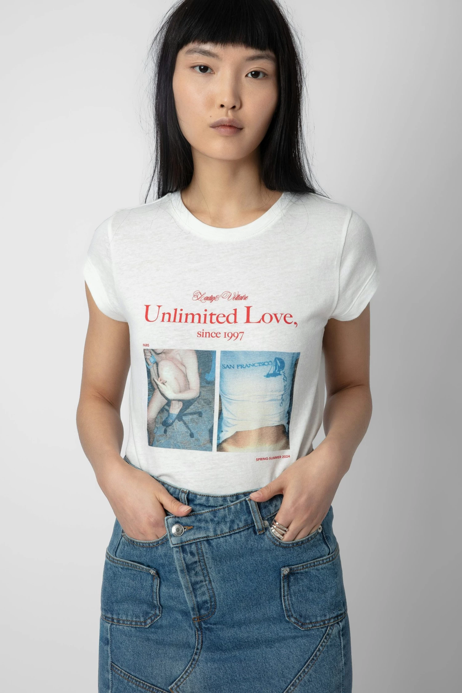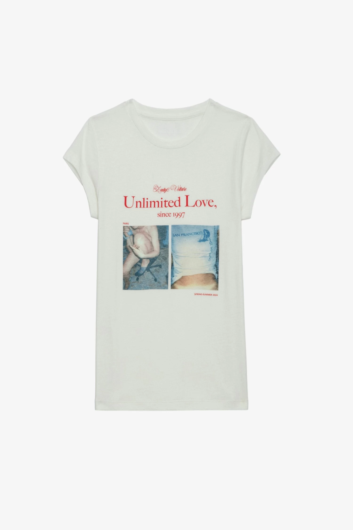 – Women’s white t-shirt – Photo print on front – “Zadig & Voltaire, Unlimited Love, since 1997″ print on front – Short sleeves, rounded collarModel is 174 cm / 5′ 8” and is wearing a size S**Fibers from organic farming