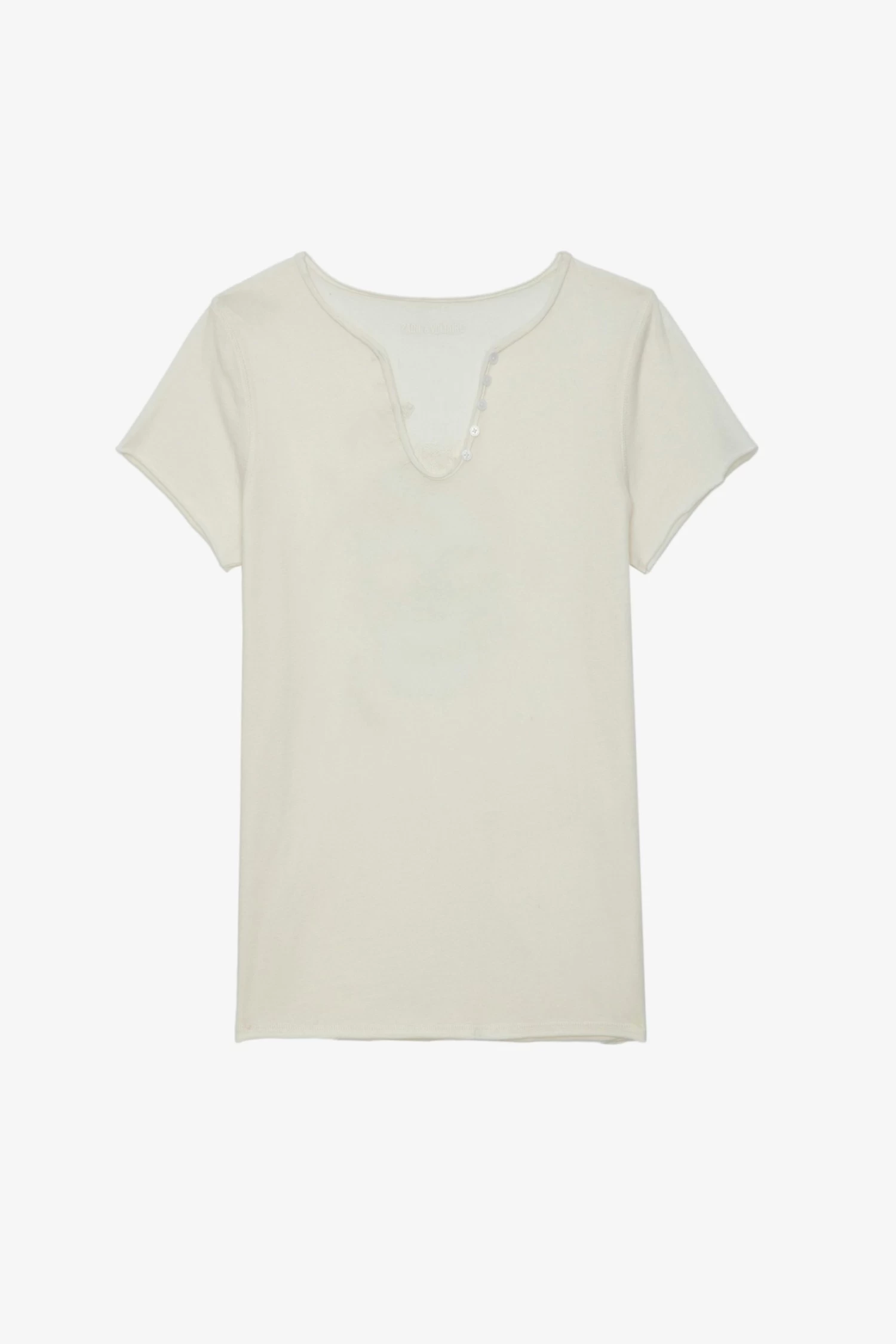 – Women’s white cotton t-shirt – Short sleeves – Sheer fishnet skull design on back – V neck with buttons**Fibers from organic farming