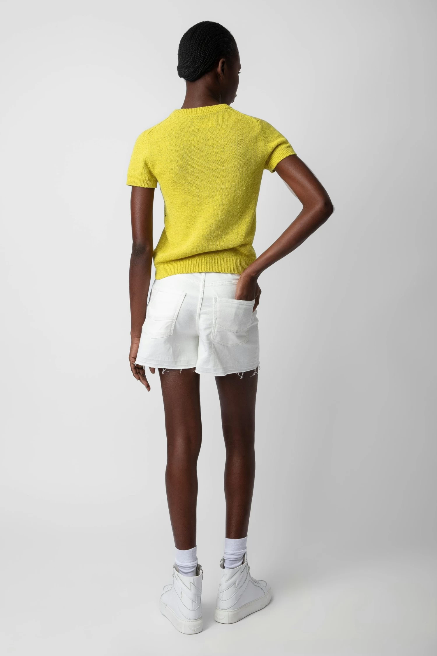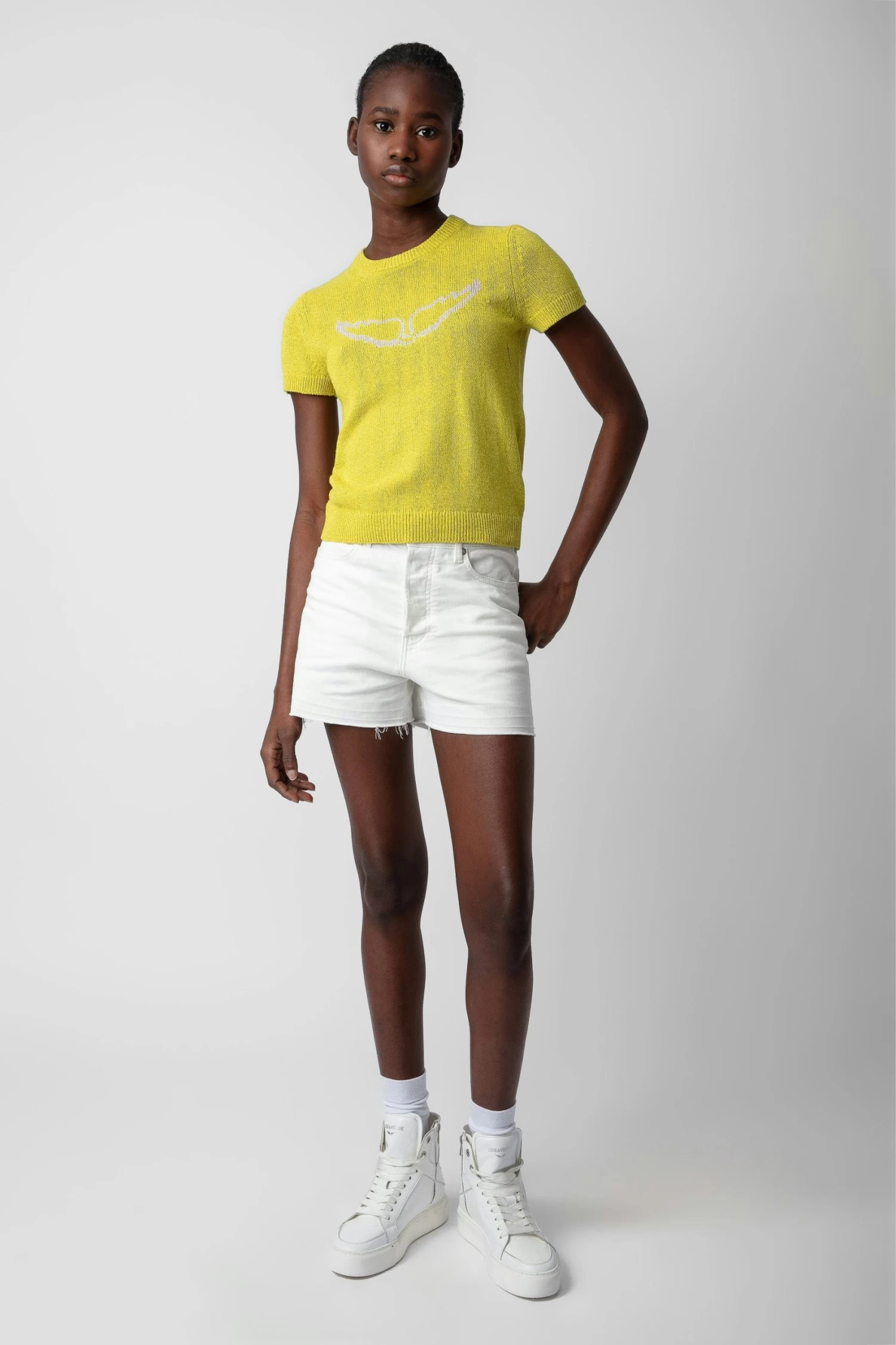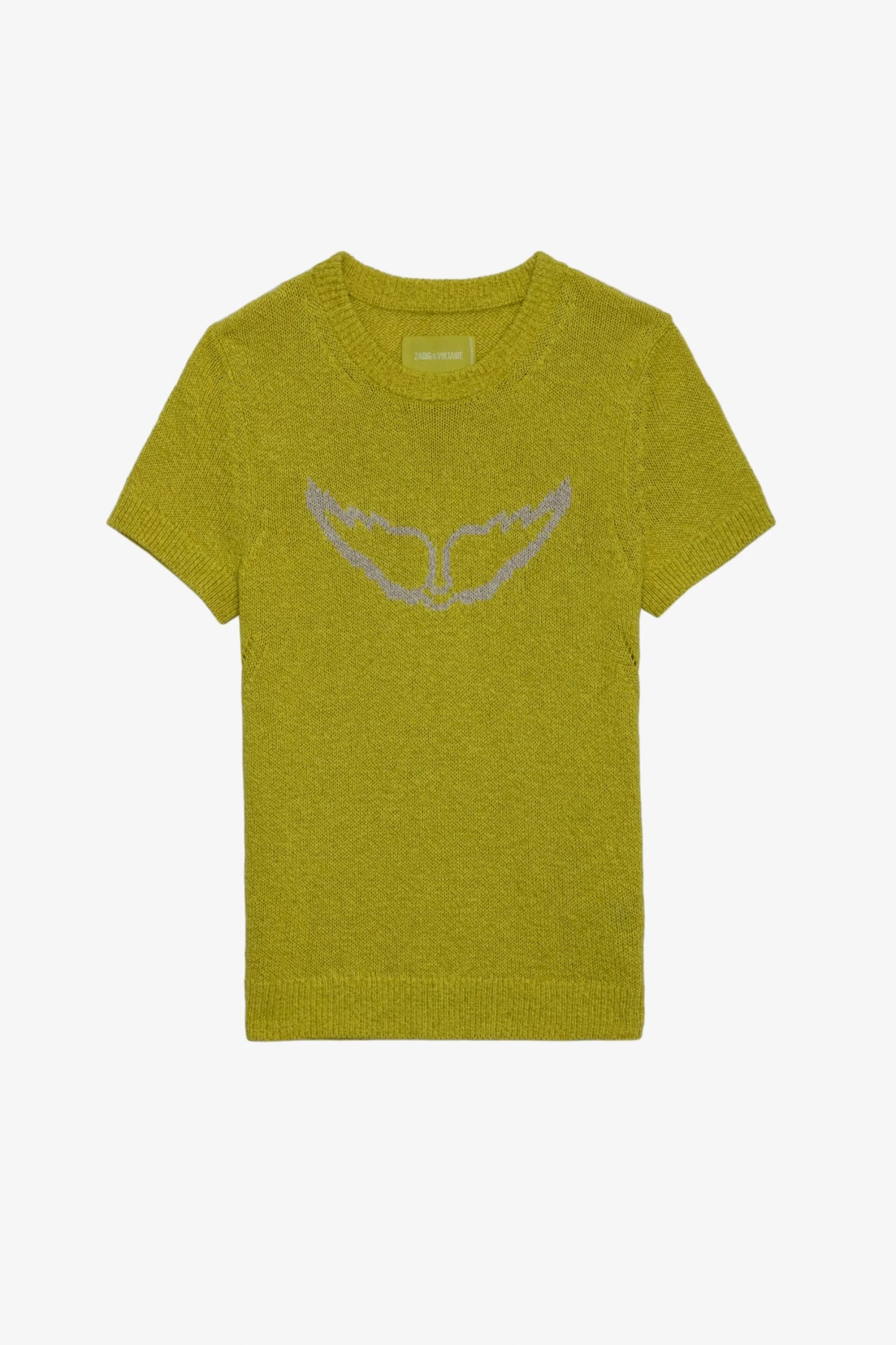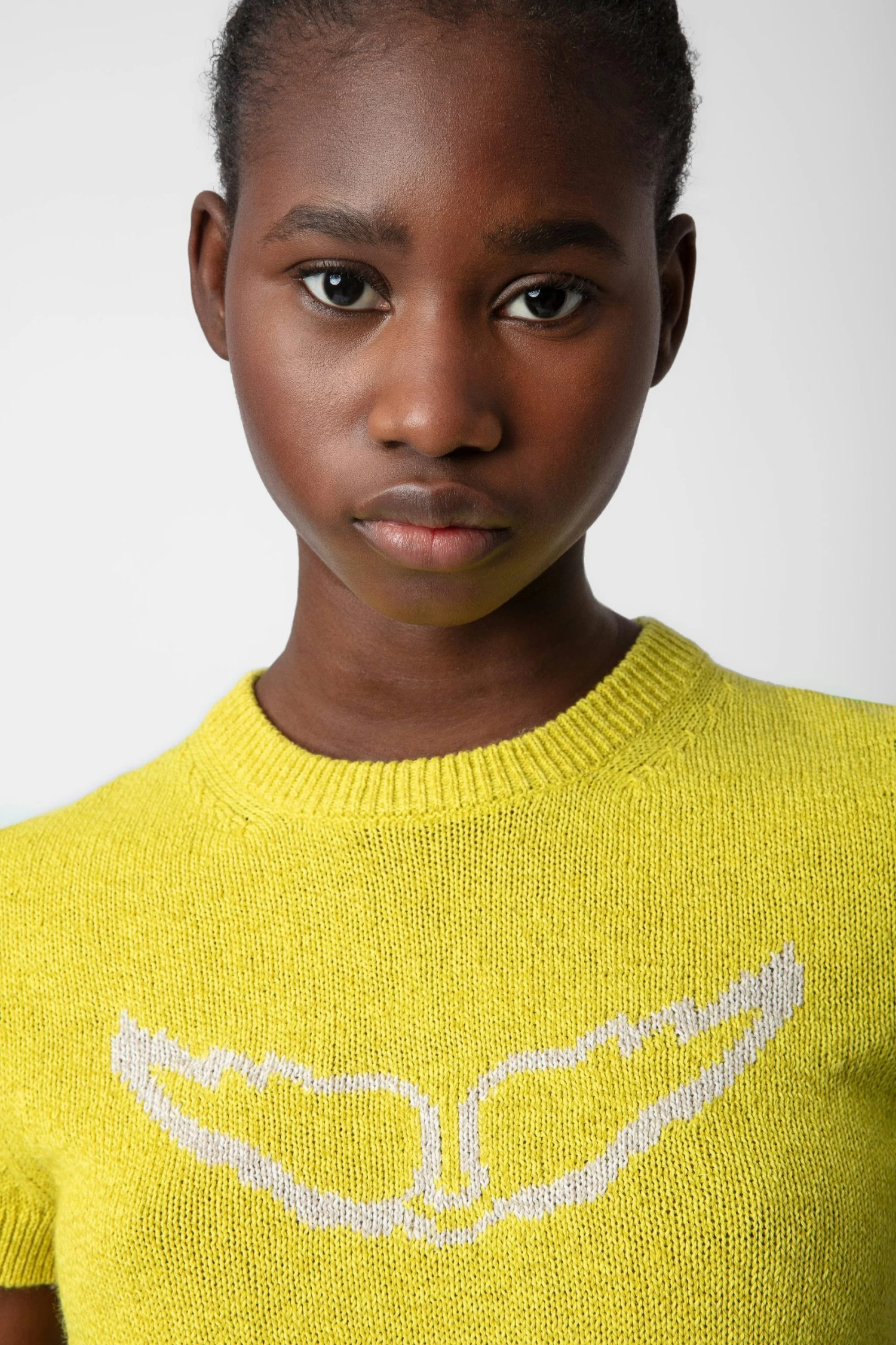 Yellow linen and cotton short-sleeved sweater with intarsia jacquard wings.