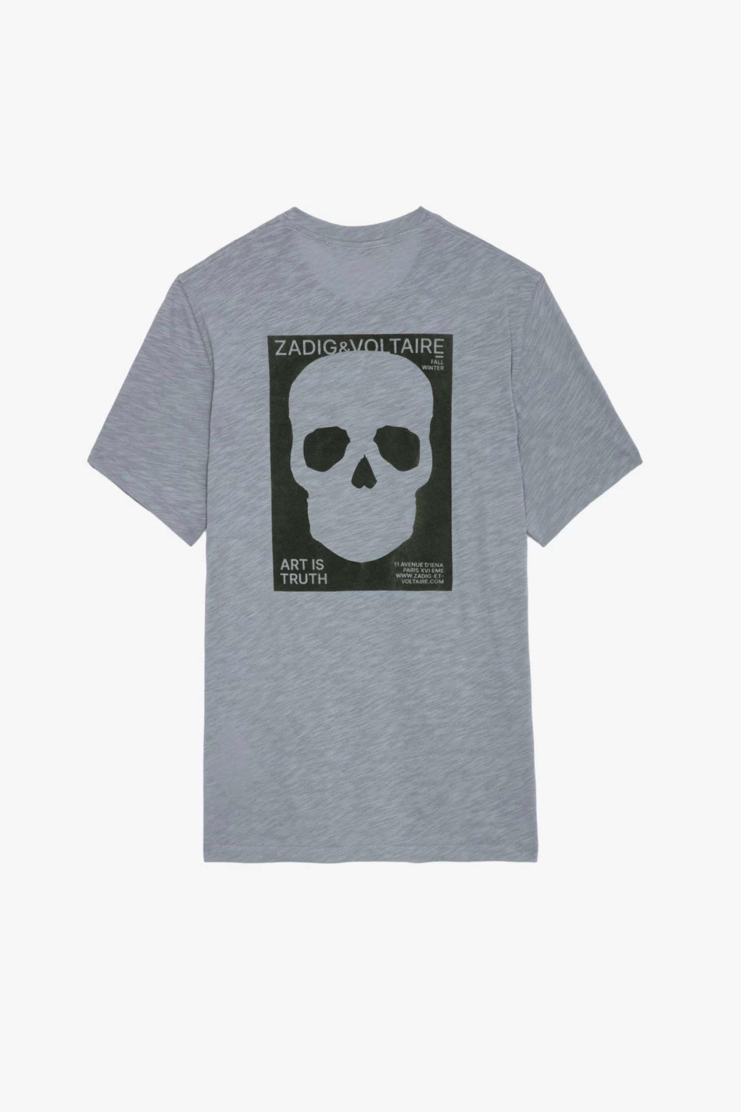 Grey slub cotton short-sleeved T-shirt with pocket and Skull Block motif on the back.