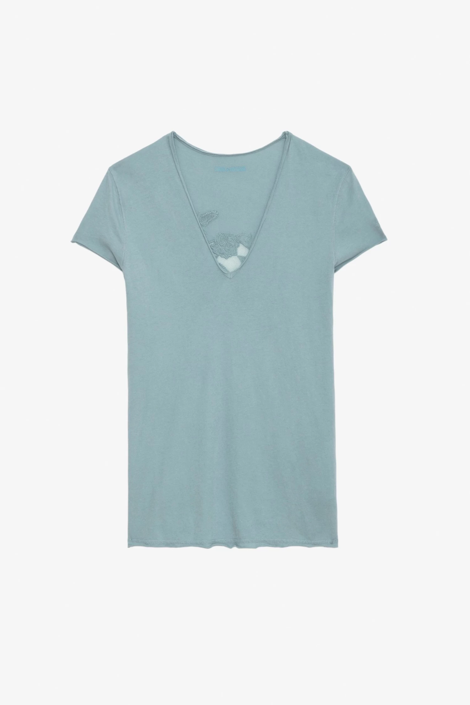 Sky blue organic cotton short-sleeved T-shirt with skull and floral embroidery on the back.