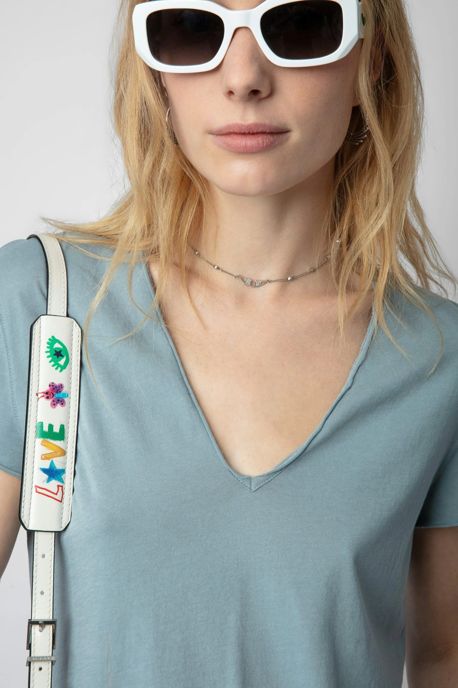 – Women’s Glacier sky blue organic cotton T-shirt – Floral and skull embroidery on the back – V neckline – Short sleeves Model is 178 cm / 5′ 10″ and is wearing a size S