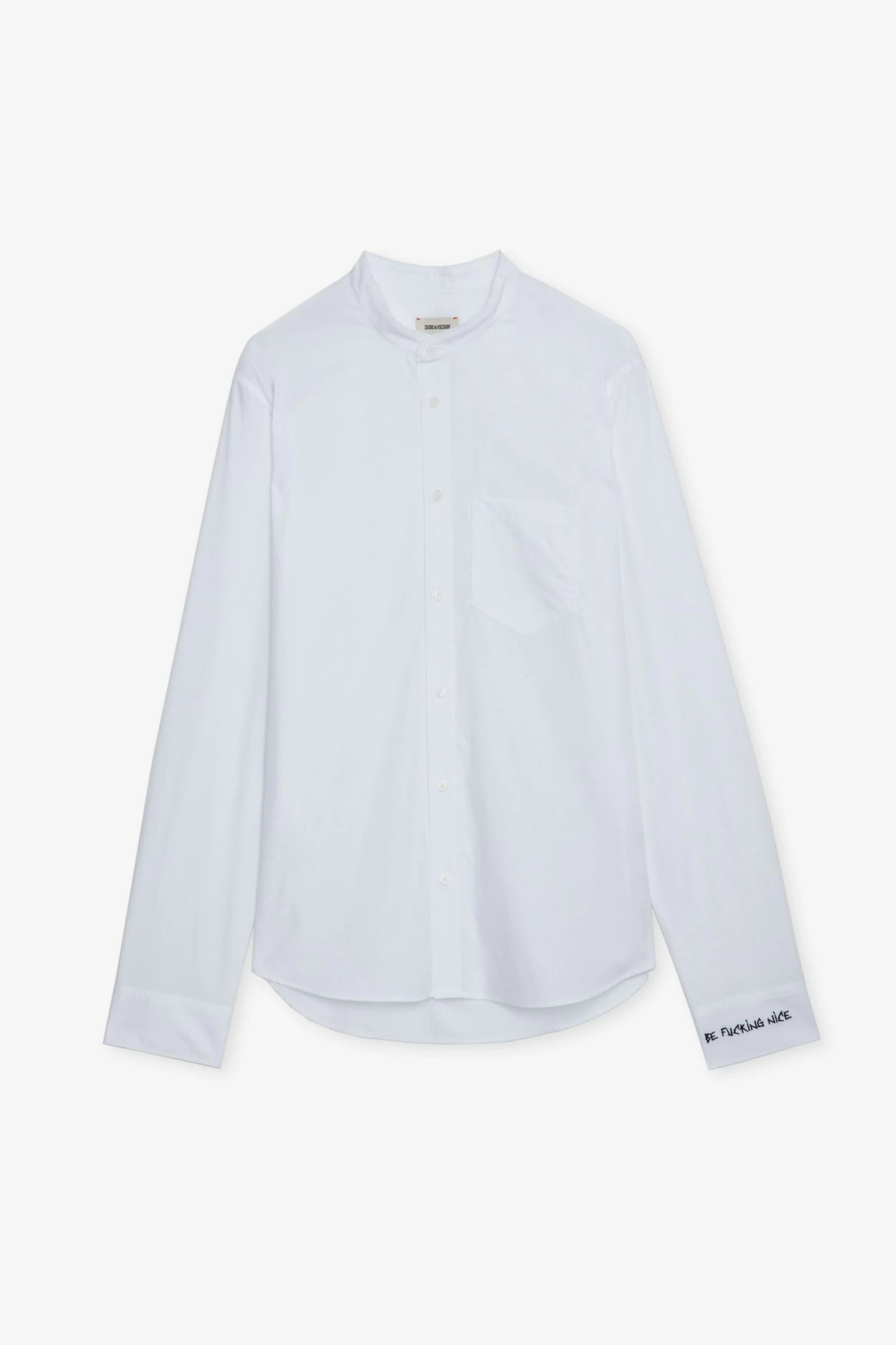 – Men’s white cotton poplin shirt – Fitted body – Band collar with raw edge finishes – Button fastening and patch pocket on the chest with raw edge finishes – Long sleeves and buttoned cuffs – “Be Fucking Nice” embroidery on the left cuff – Made in Portugal Model is 188 cm / 6′ 2″ and is wearing a size M**Fibers from organic farming