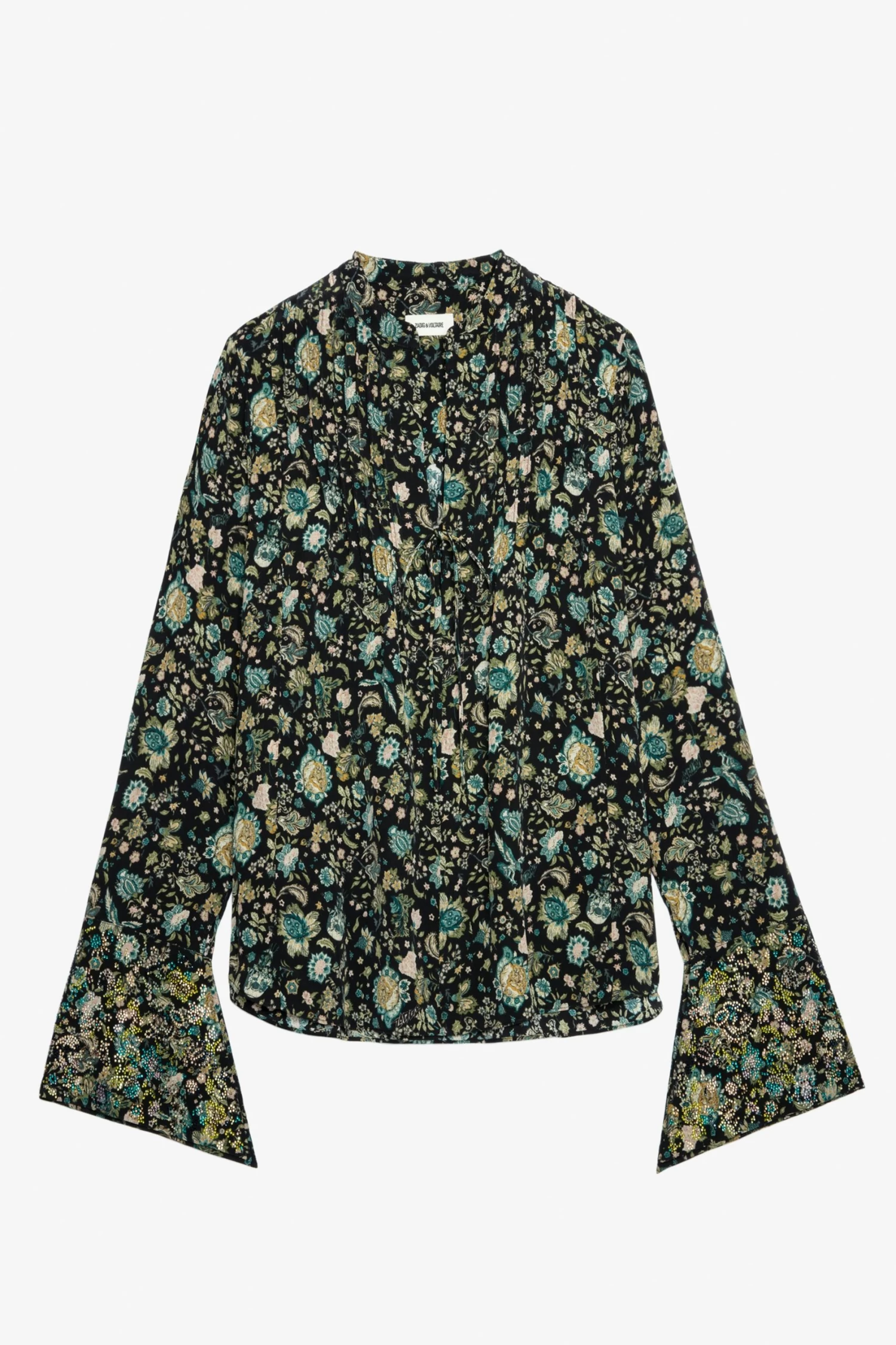 Black silk floral-print blouse with diamanté on cuffs, tie collar and long sleeves.