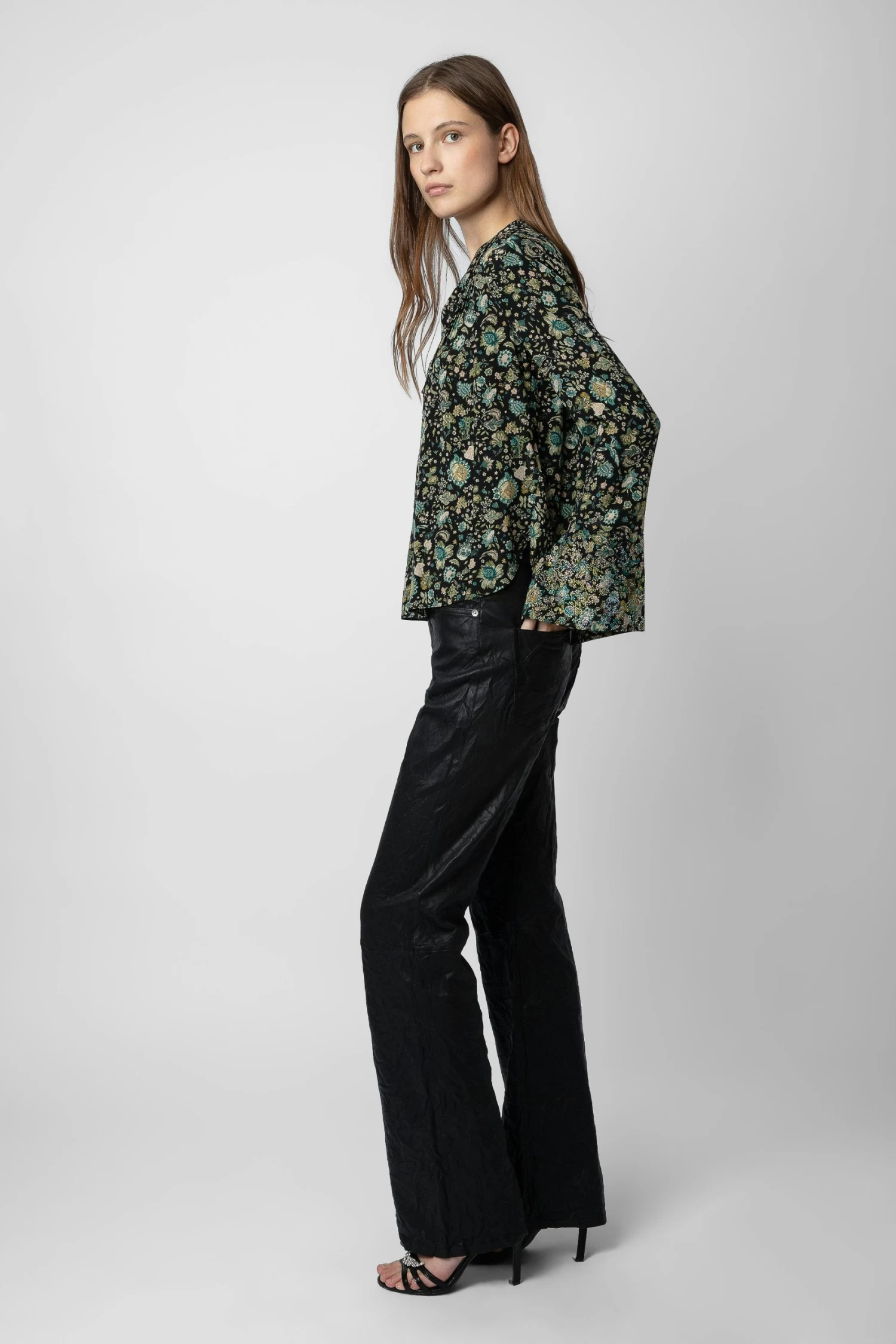 – Women’s flowing black loose-fitting blouse – Floral-print silk – Diamanté details on asymmetric cuffs – Open collar, ties and pleats at the back Model is 180 cm / 5′ 10″ and is wearing a size S