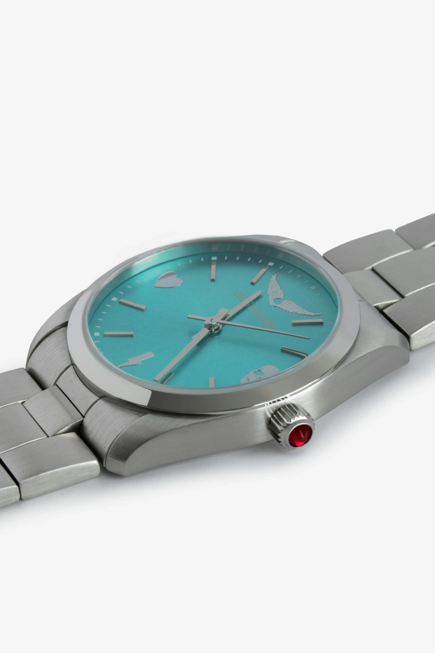 Switch to Zadig&Voltaire time with this stainless steel watch set with a rhinestone, with a blue face in the signature style of the brand. – Zadig&Voltaire women’s stainless steel watch – Blue Reflect face with signature patterns – Diameter 36 mm – Contrasting rhinestone – Quartz movement – Houru002Fminuteu002Fsecond functions – Steel watchband