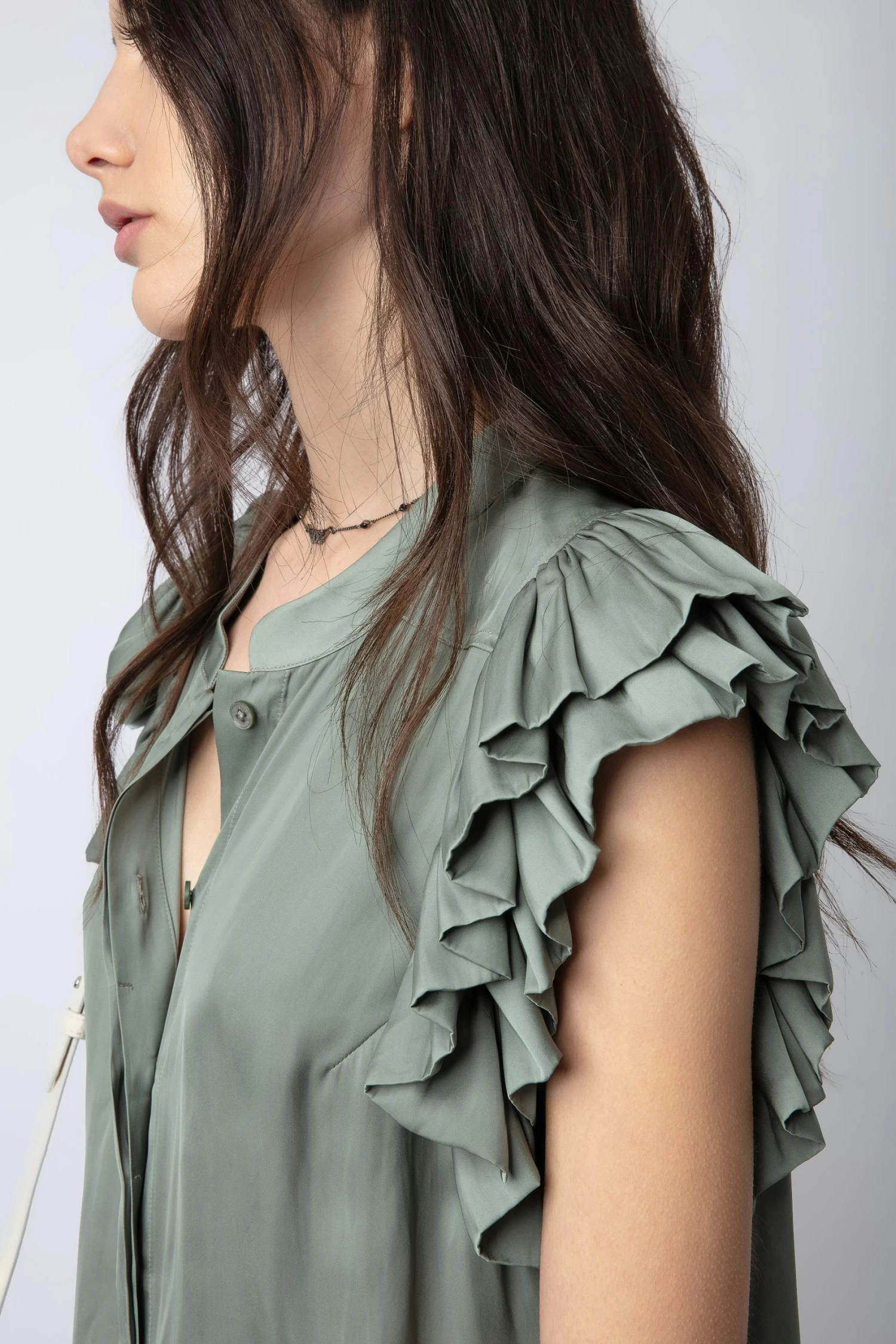 – Women’s Treillis khaki flowing satin top – Round neckline – Buttoned and pleats at the back – Gathered, ruffled short sleeves **recycled fibers