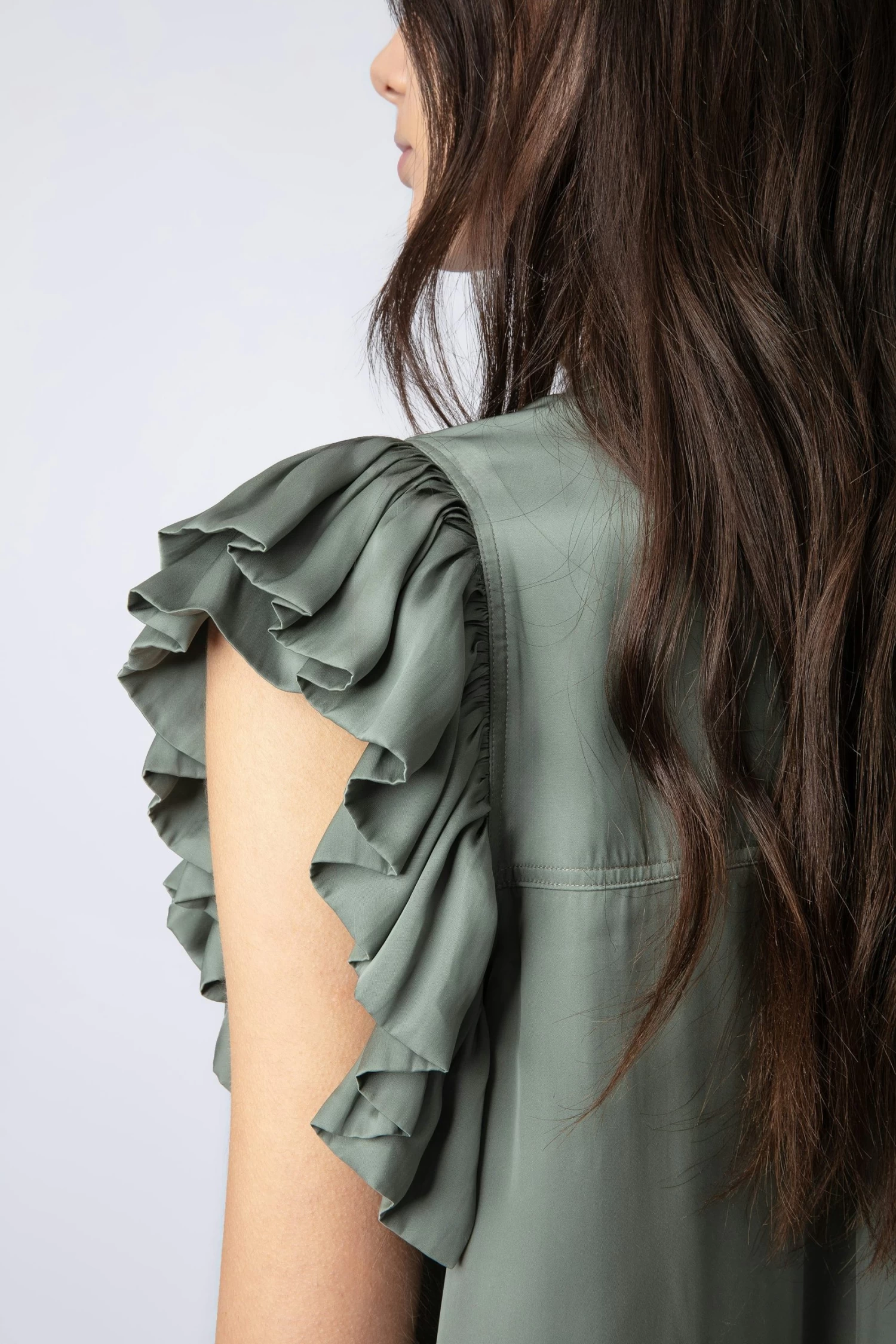 Khaki satin short-sleeved top with ruffles and gathers.