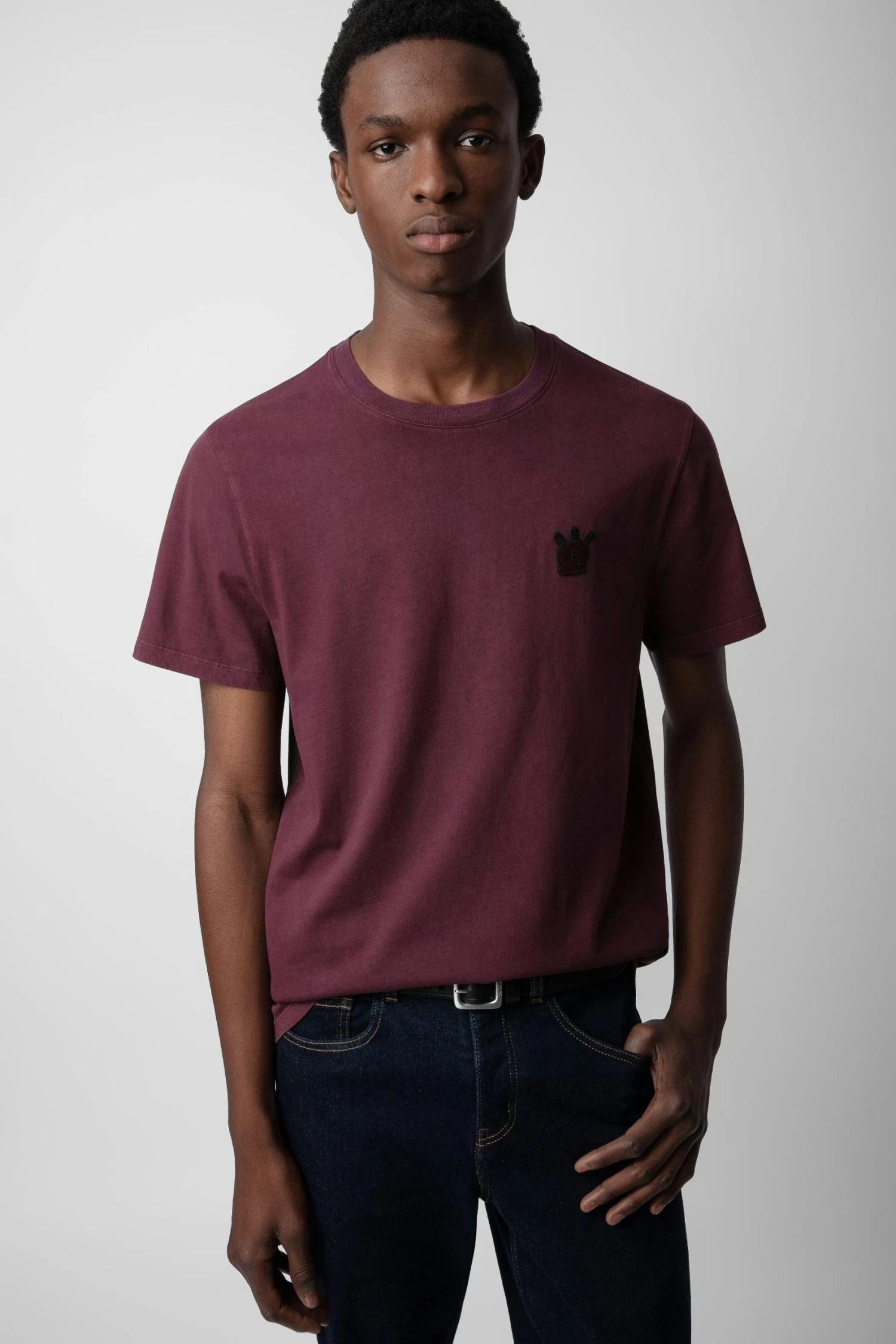 Burgundy cotton round-neck T-shirt with short sleeves and Skull XO patch.