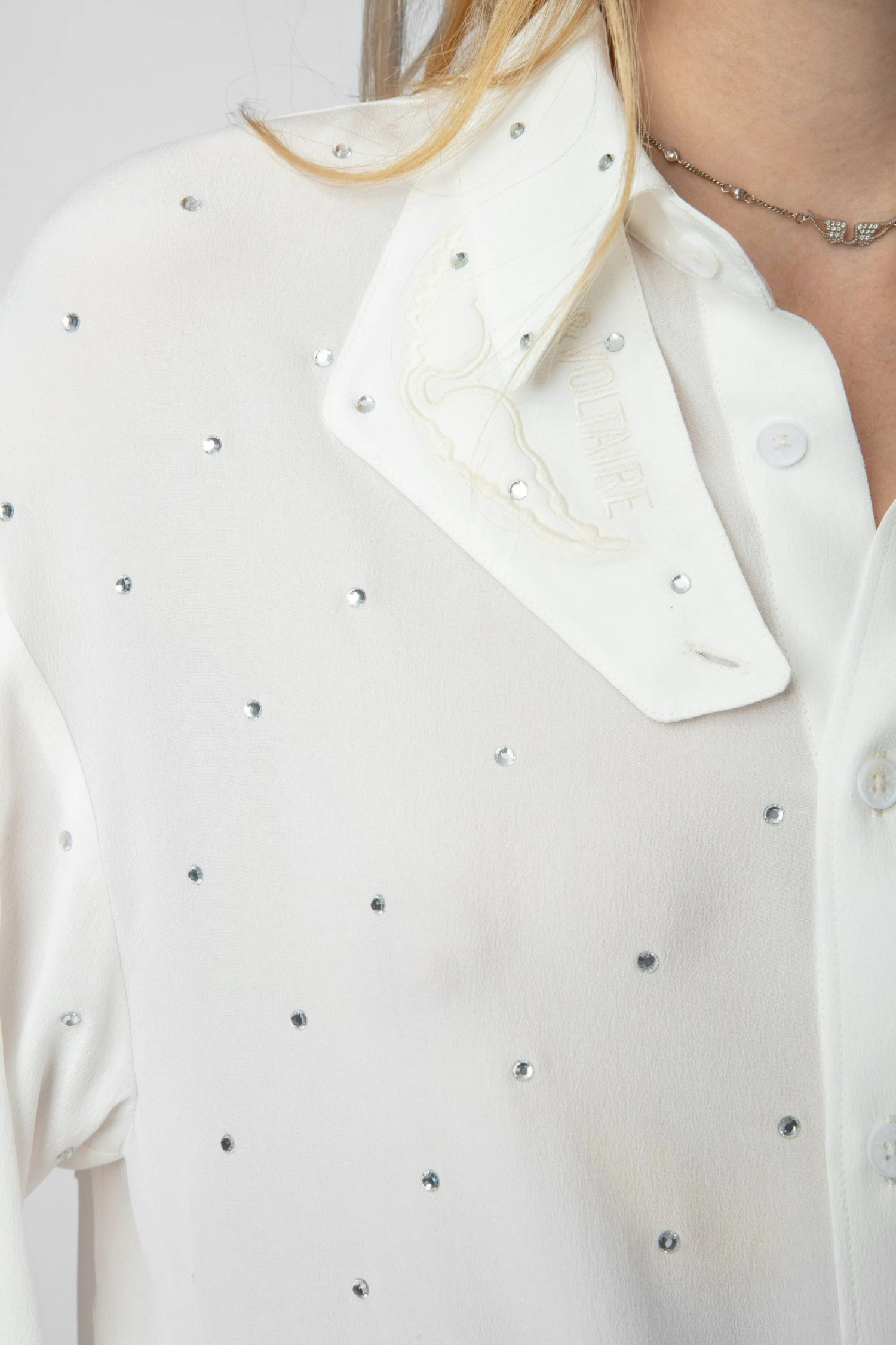Women’s white diamanté silk shirt with detachable tab at collar.