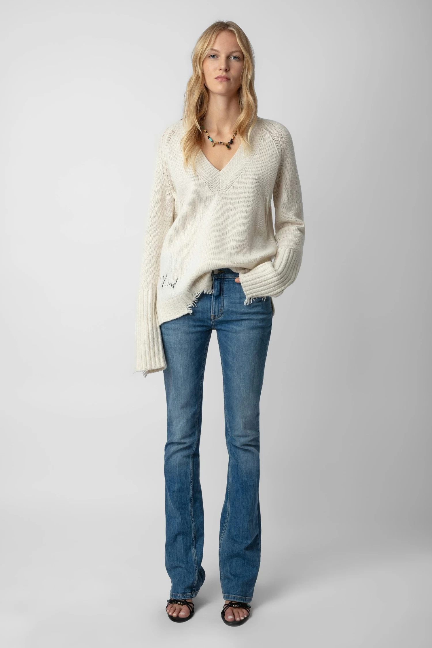 – Women’s white merino sweater – V neckline – Long sleeves – Distressing on sleeves and hem – Pointelle “AMOUR” detail on back and ZV logo on hem Model is 174 cm / 5′ 8″ and is wearing a size S*Contains 100% RWS certified woolThe Responsible Wool Standard (RWS) guarantees animal welfare and respect for pastures. It also ensures end-to-end traceability of the wool through the supply chain