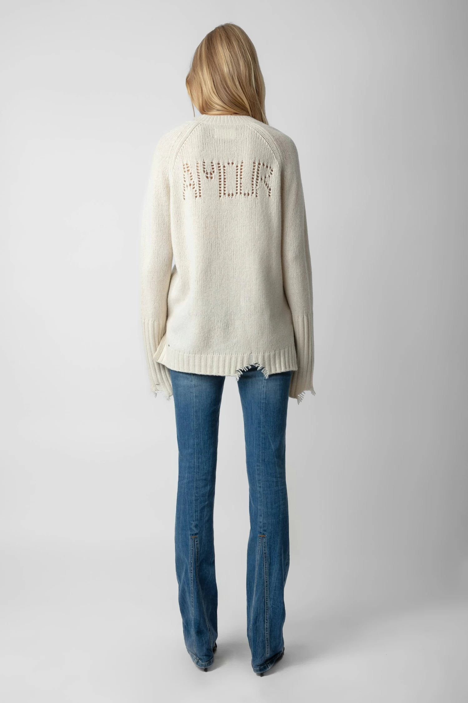 Women’s white merino wool sweater with pointelle “AMOUR” detail on back.