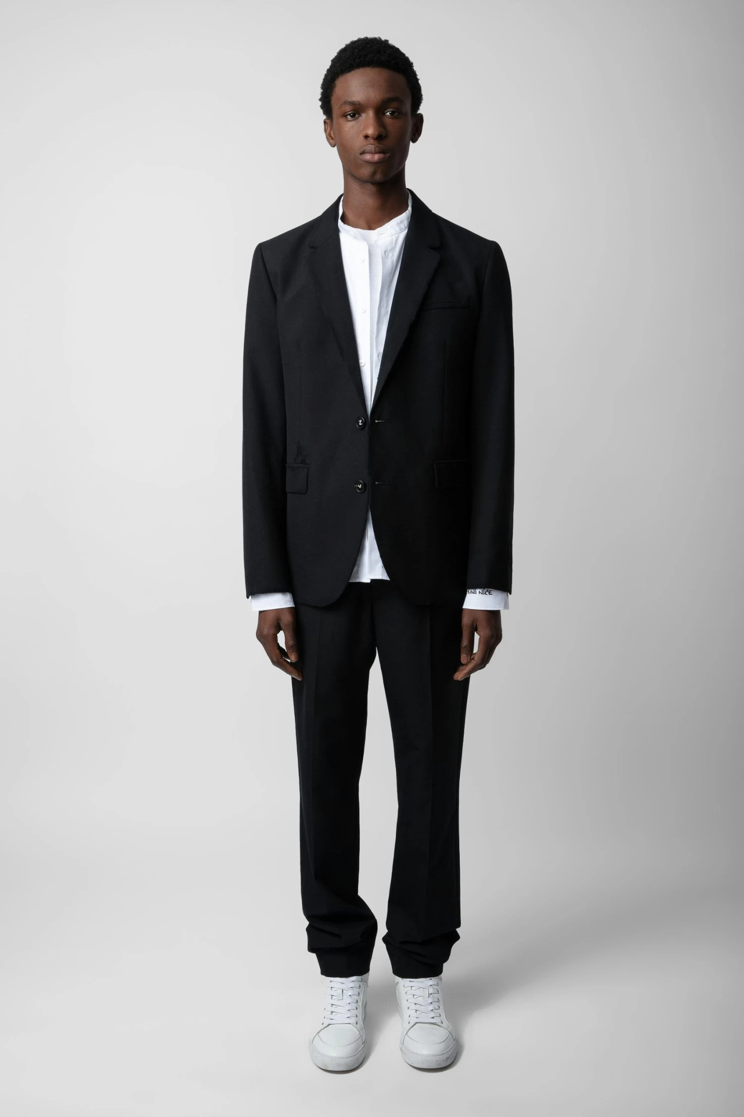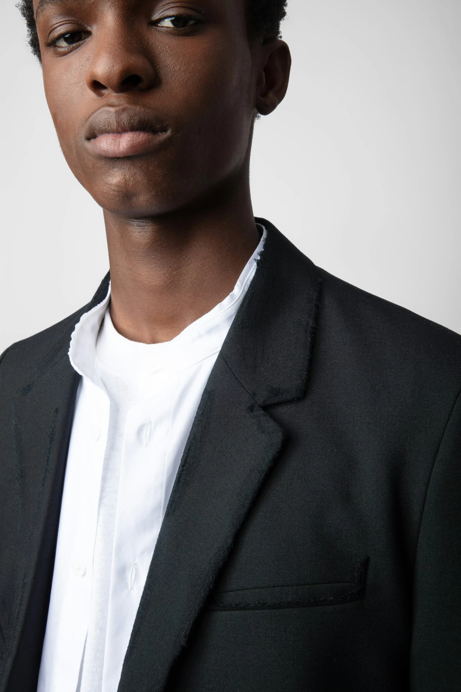 – Men’s structured wool blazer – Distressed details on collar, lapel, sleeves, and pockets – Tailored collar – Piped chest pocket and 2 flap pockets – Button fastening – ZV stitching on front buttons – Long sleeves and mitred cuffs – Studio Homme tailoring label – Made in Portugal Model is 188 cm / 6′ 2″ and is wearing a size M