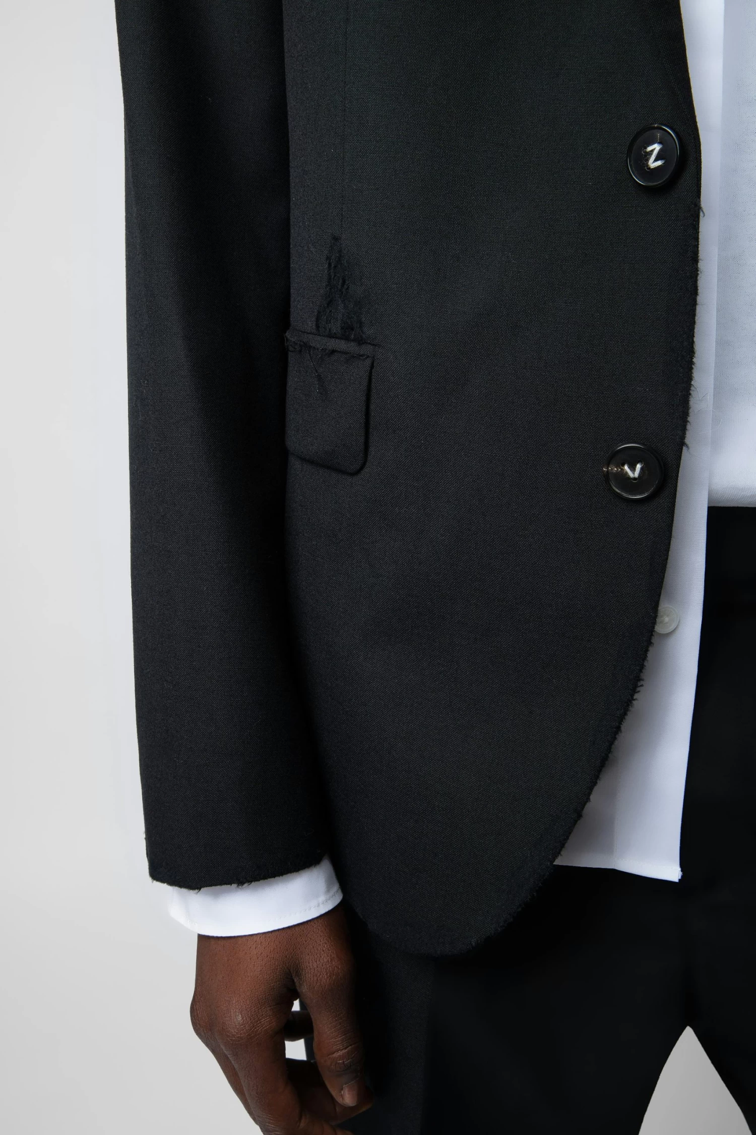 Structured black wool blazer with distressed details throughout.