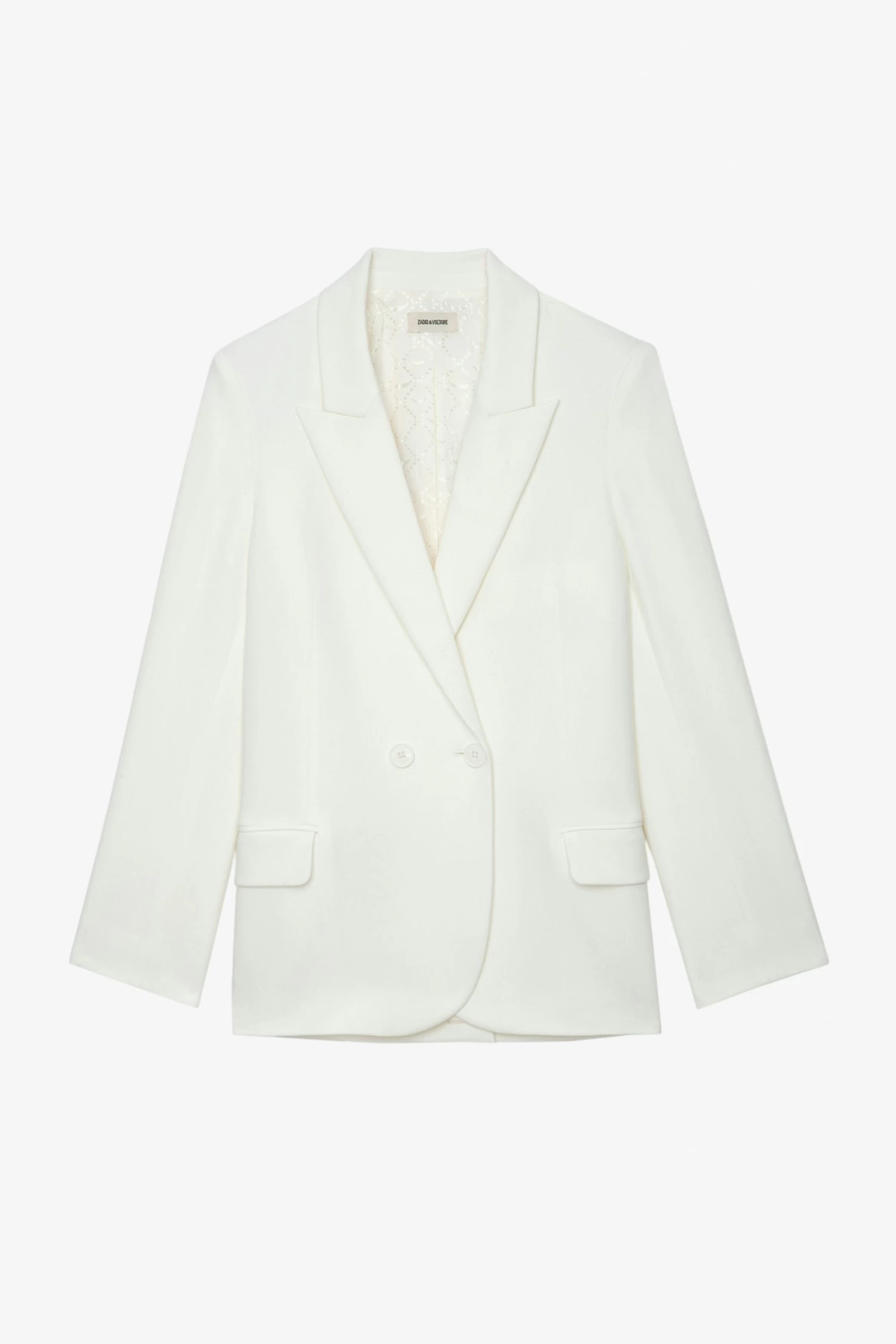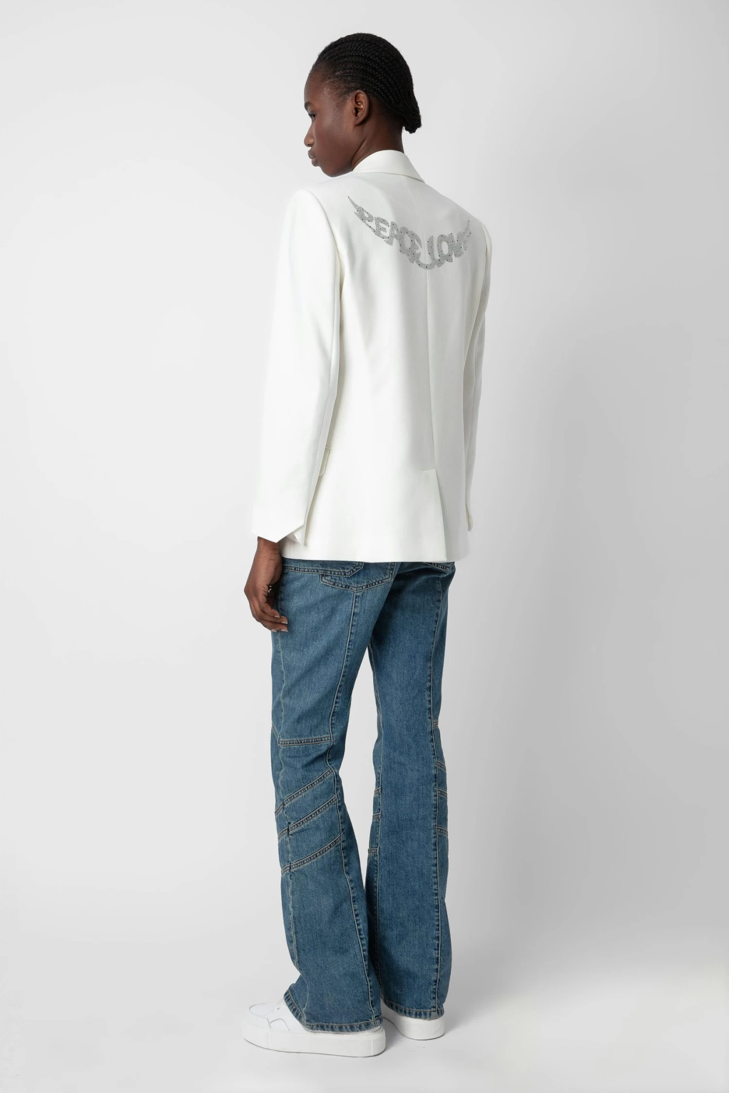 White blazer with pointed collar, button closure and diamanté “Peace Love” wings motif on the back.