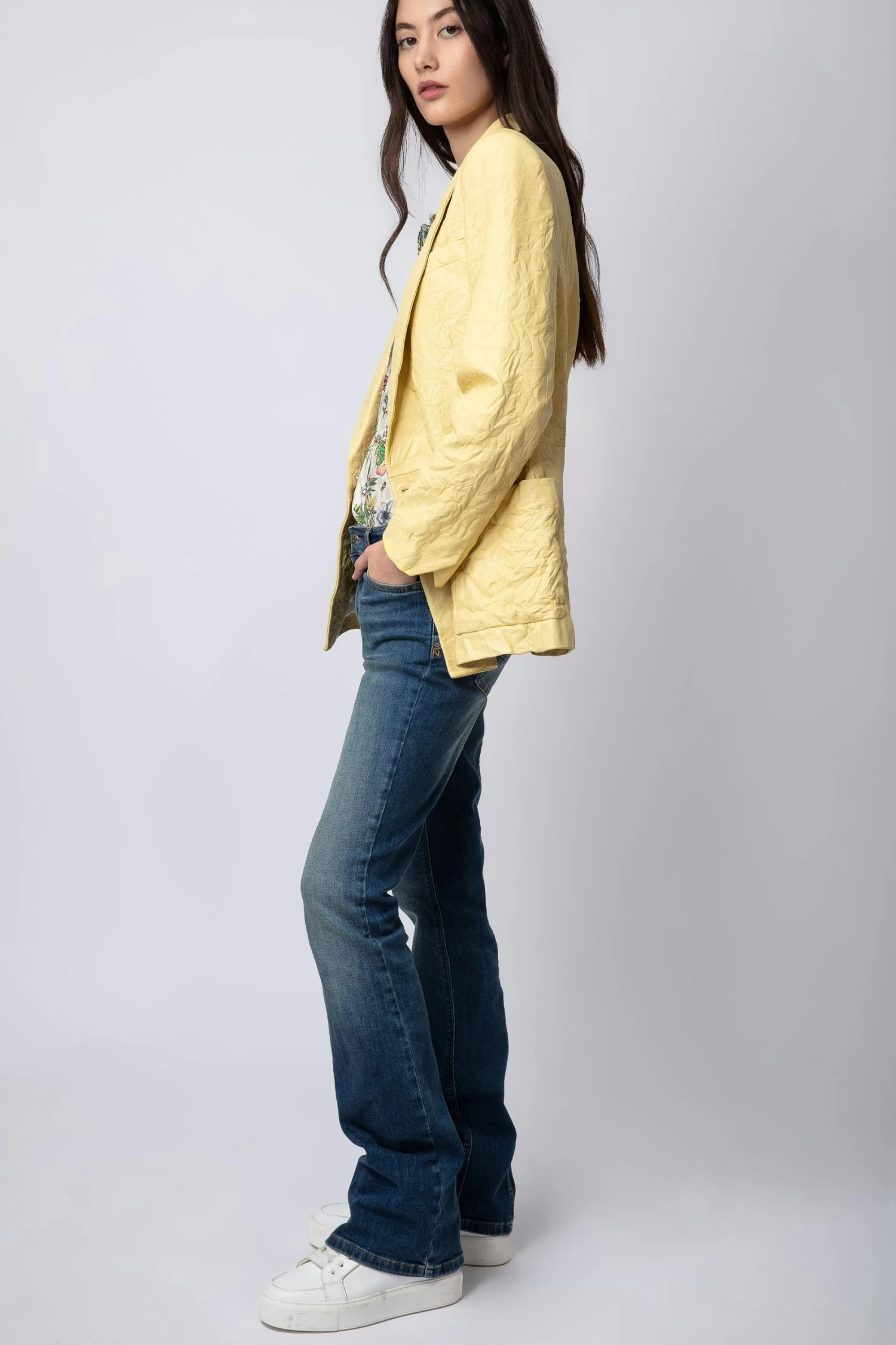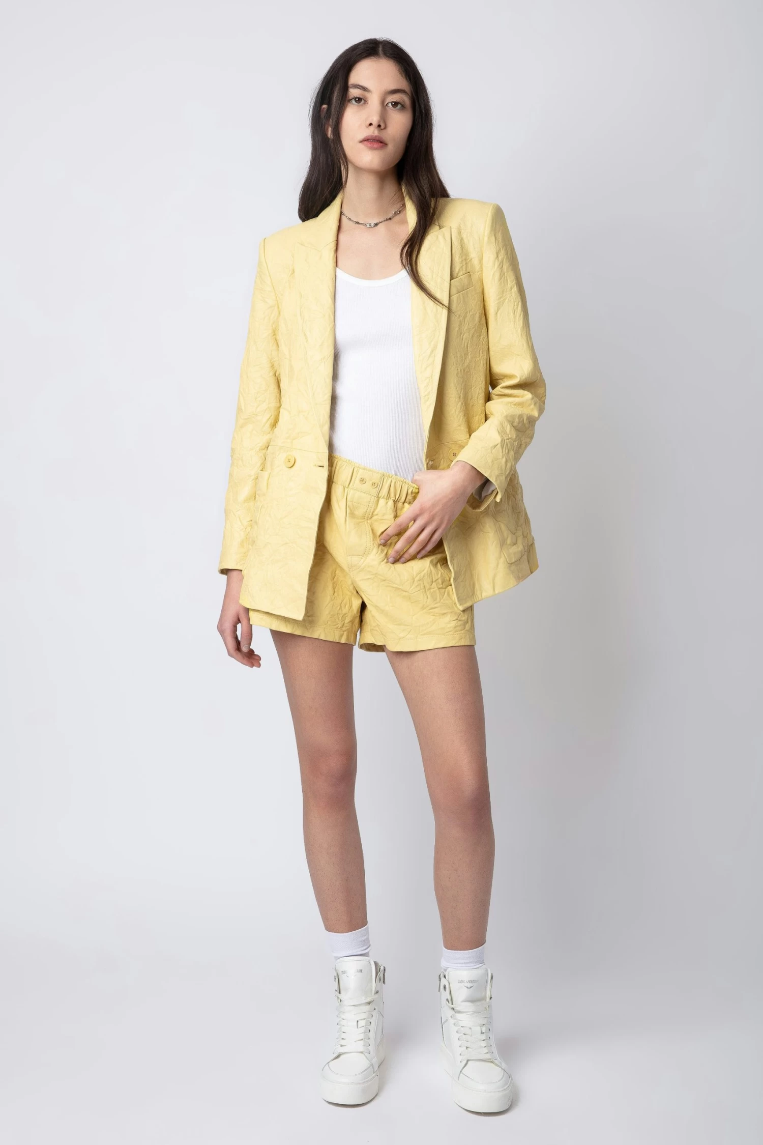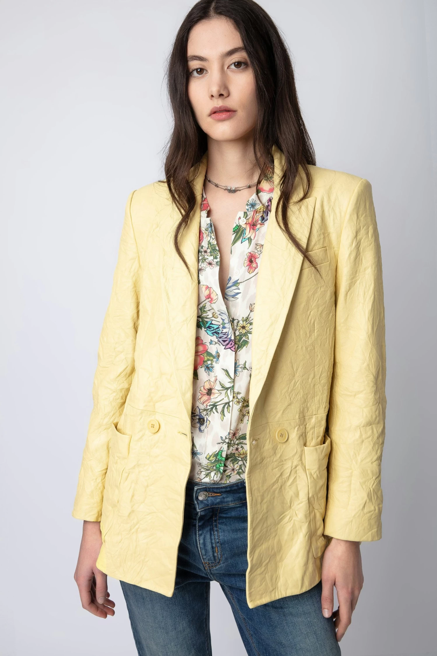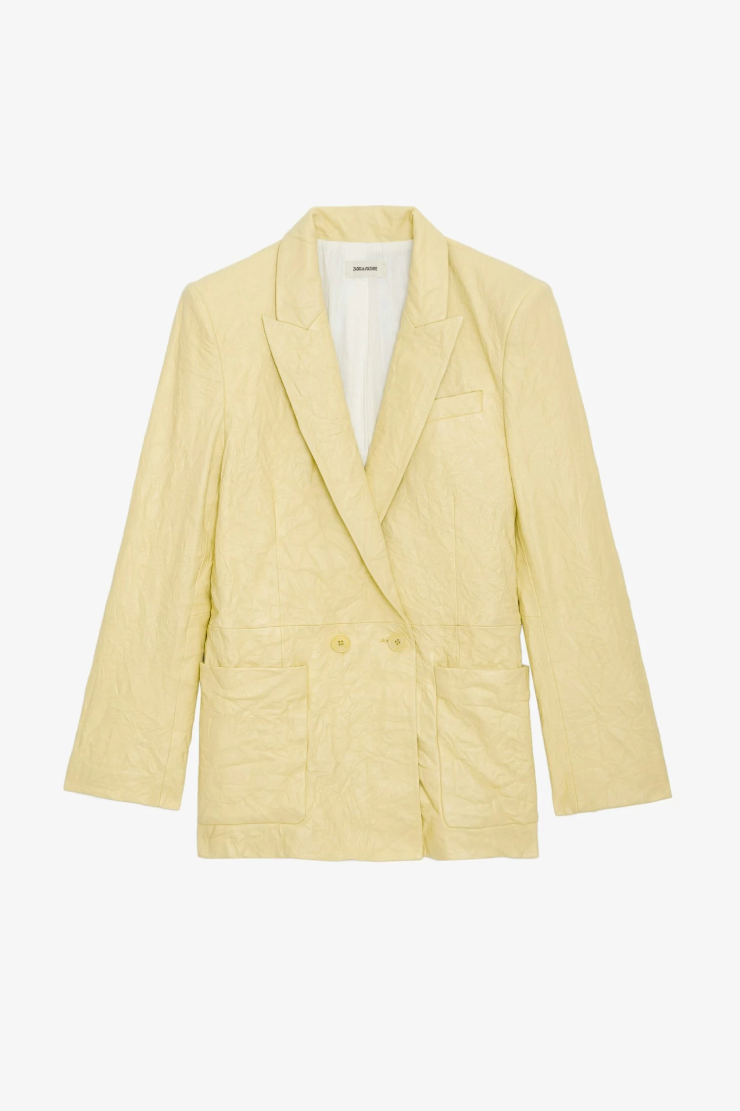 Women’s light yellow crinkled leather blazer with button fastening and pockets.