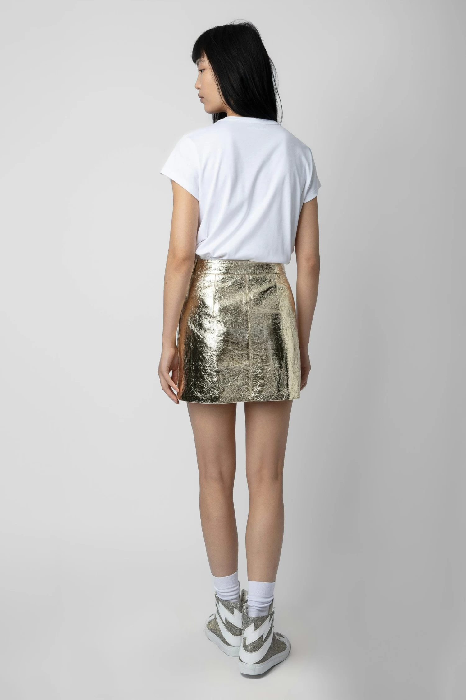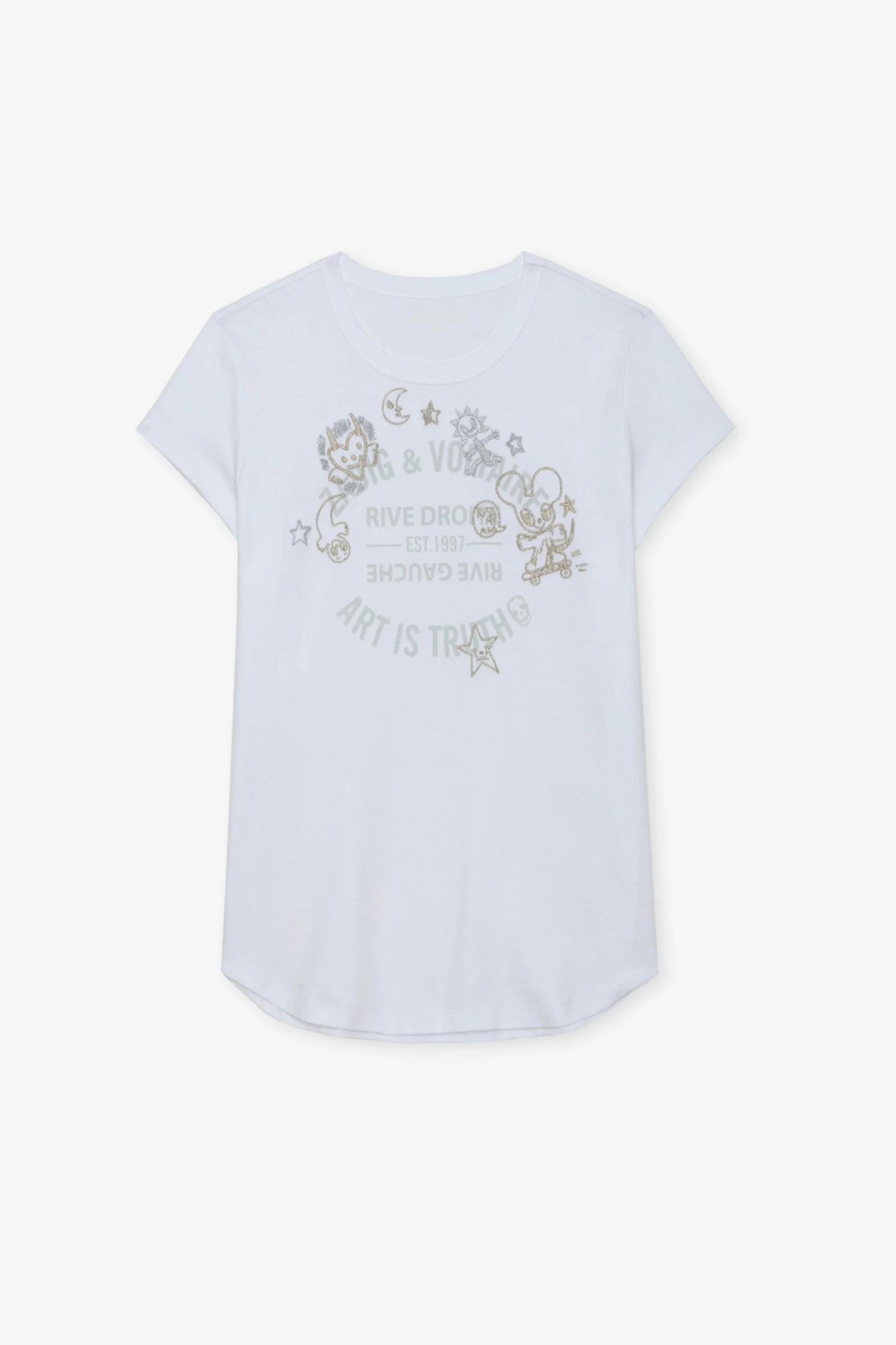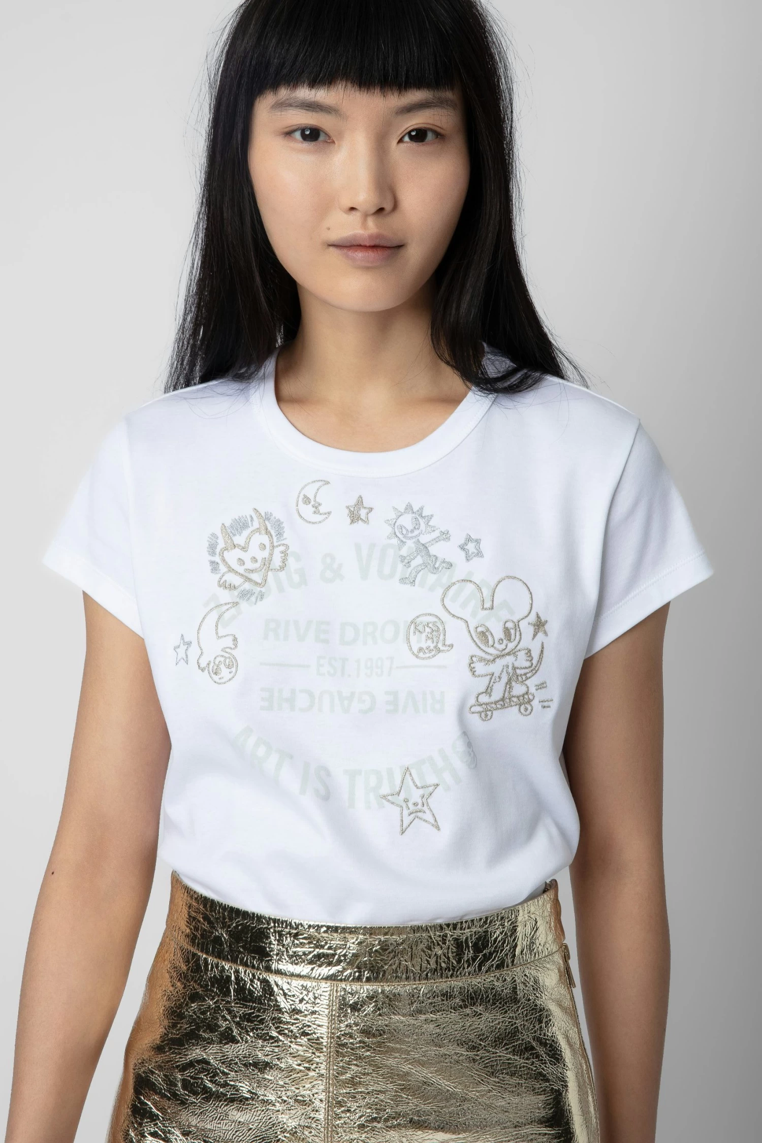 Customized details designed by Humberto Cruz, an artist and illustrator from San Diego. Influenced by pop culture, fashion and colors, he describes his work as spontaneous and quirky. – Women’s white cotton T-shirt – Decorative metallic customized details – Round neckline – Short sleeves – Made in Portugal Model is 177 cm / 5′ 9″ and is wearing a size S