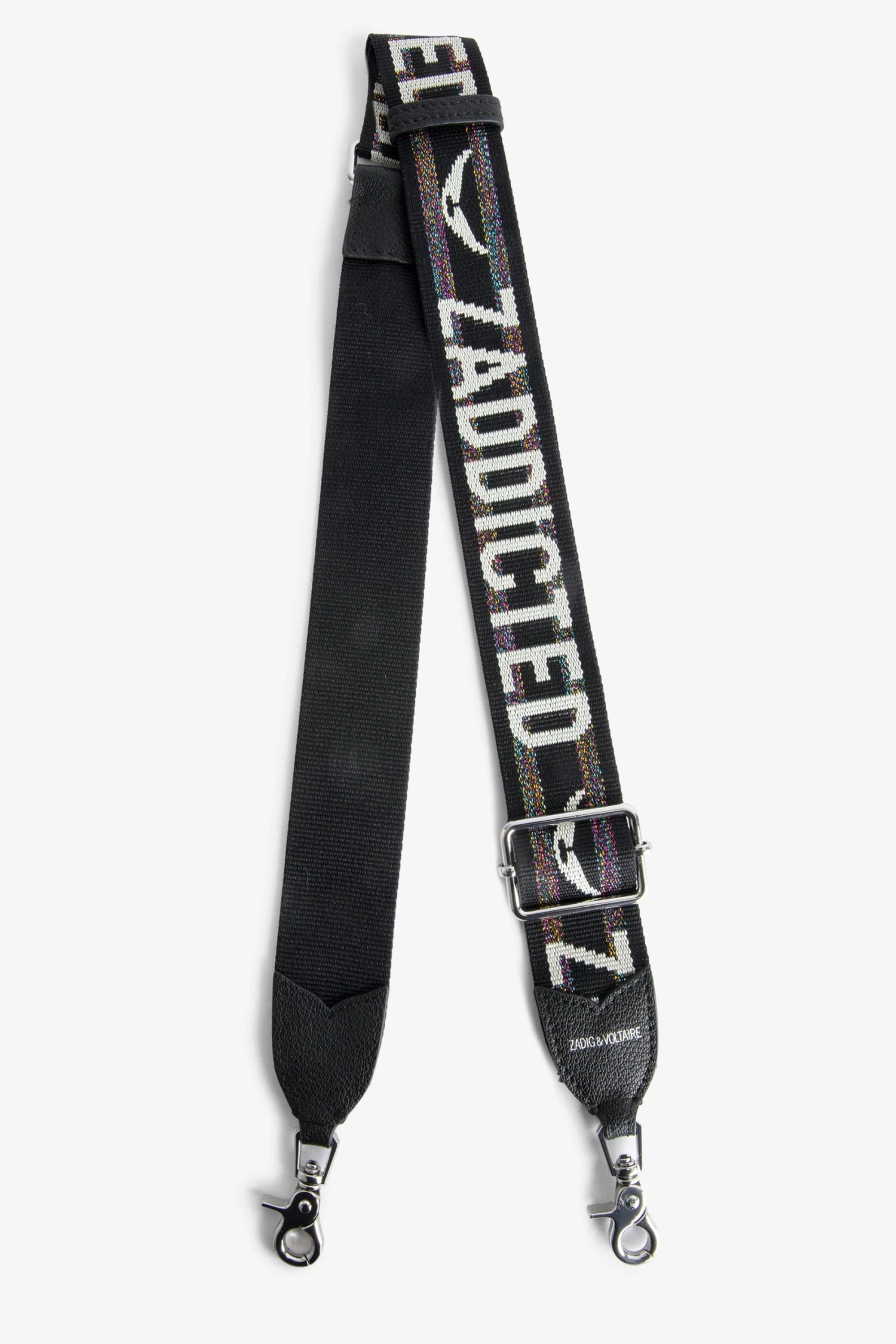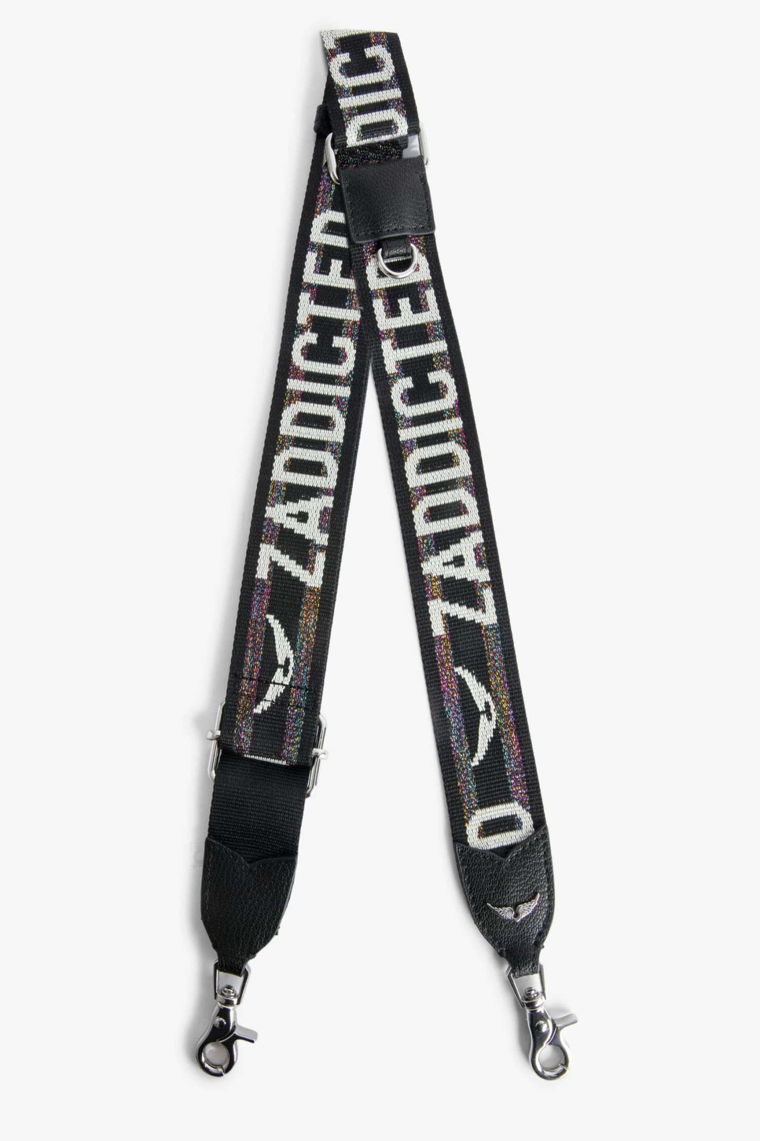 – Multicolored glitter nylon shoulder strap – Adjustable and removable – Carabiner clips – Zadig&Voltaire signature and contrasting wings – Black grained leather panels and wings charm