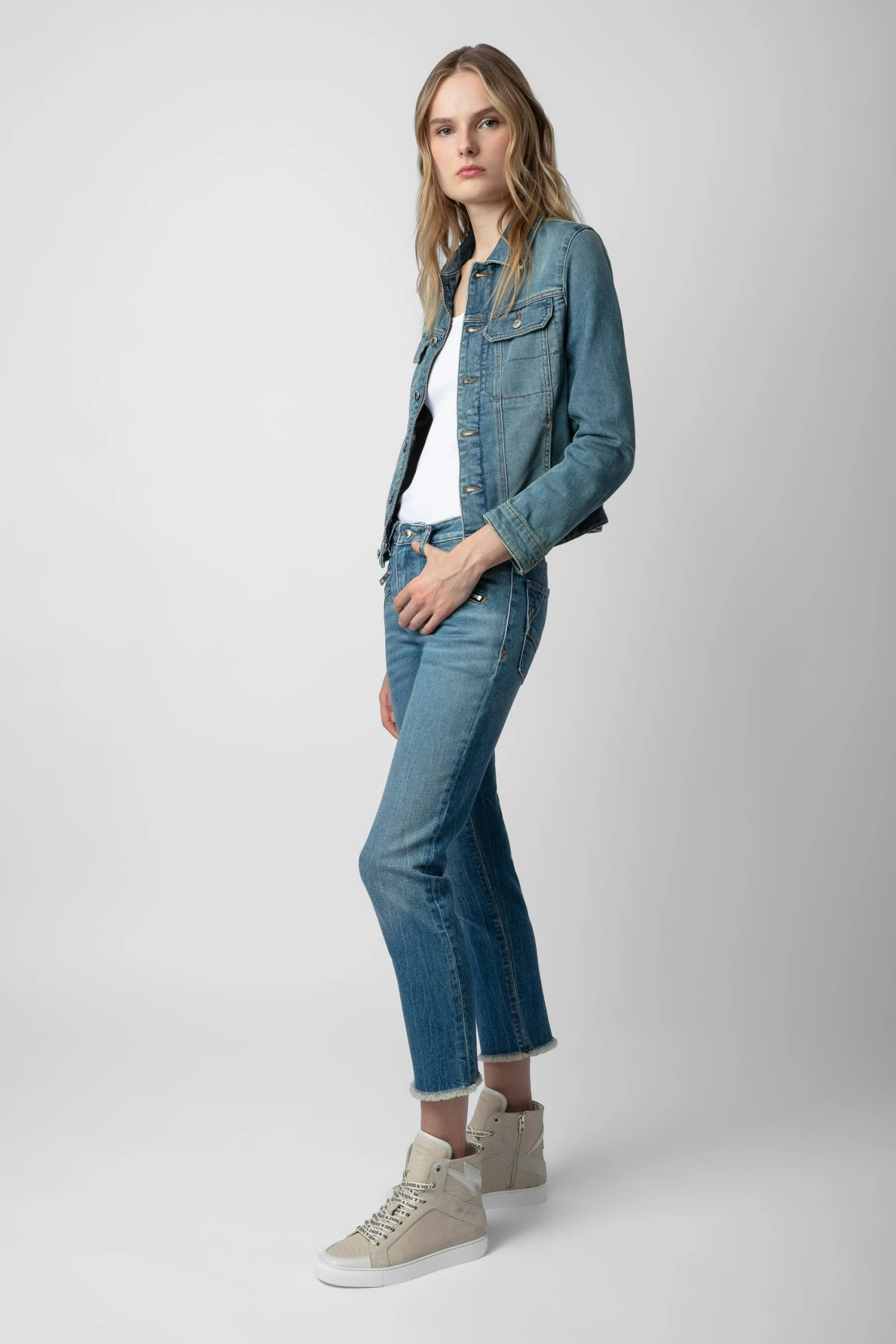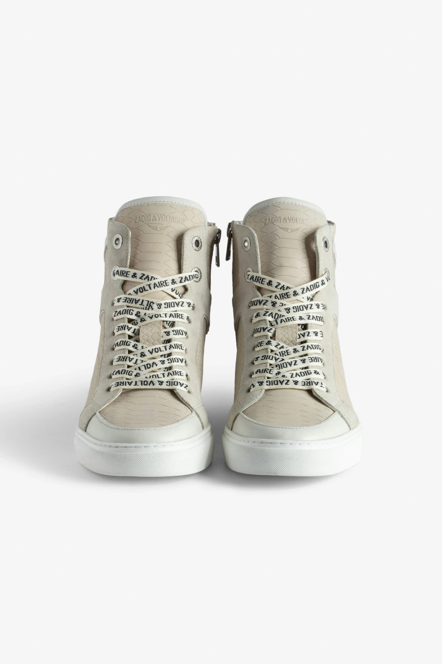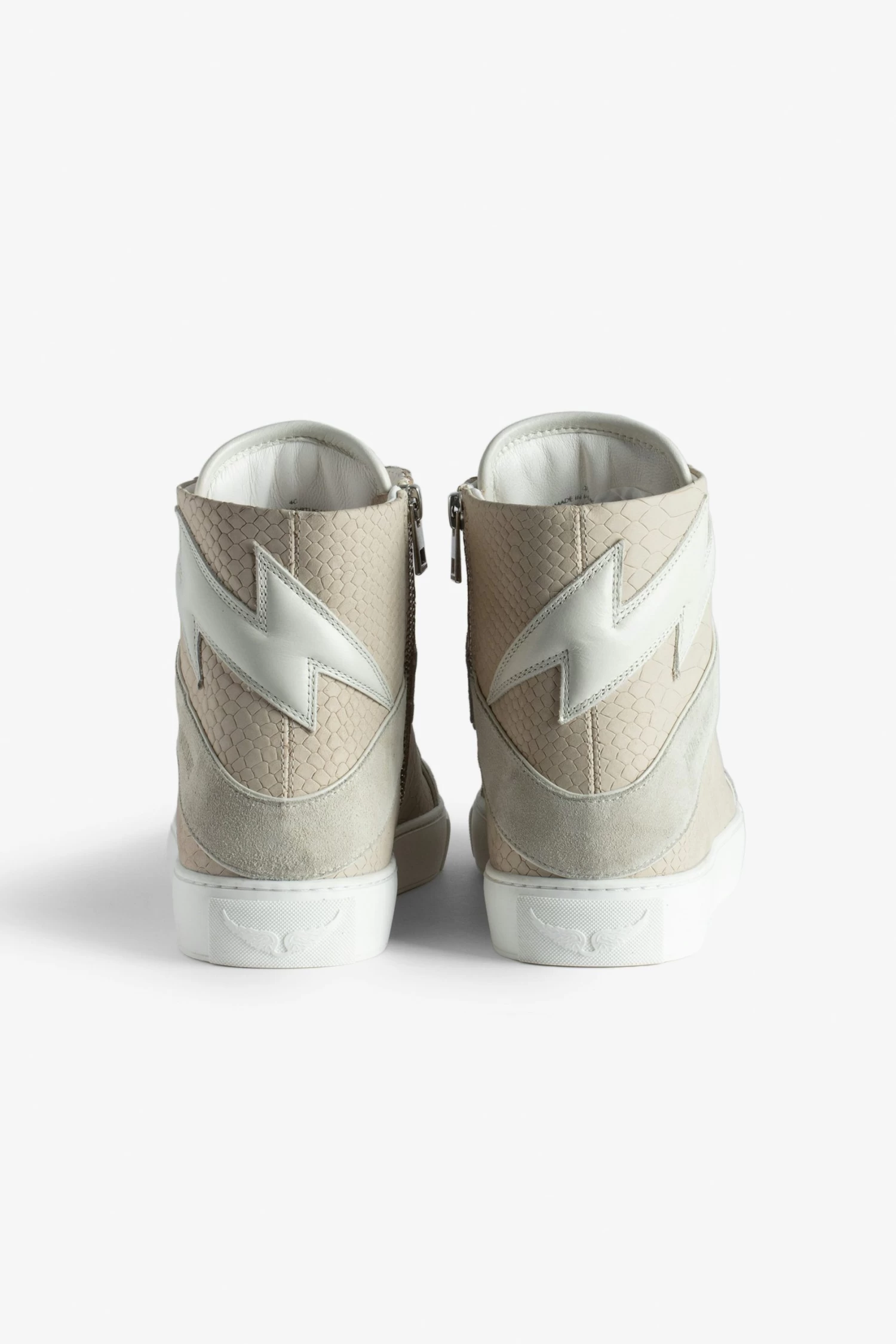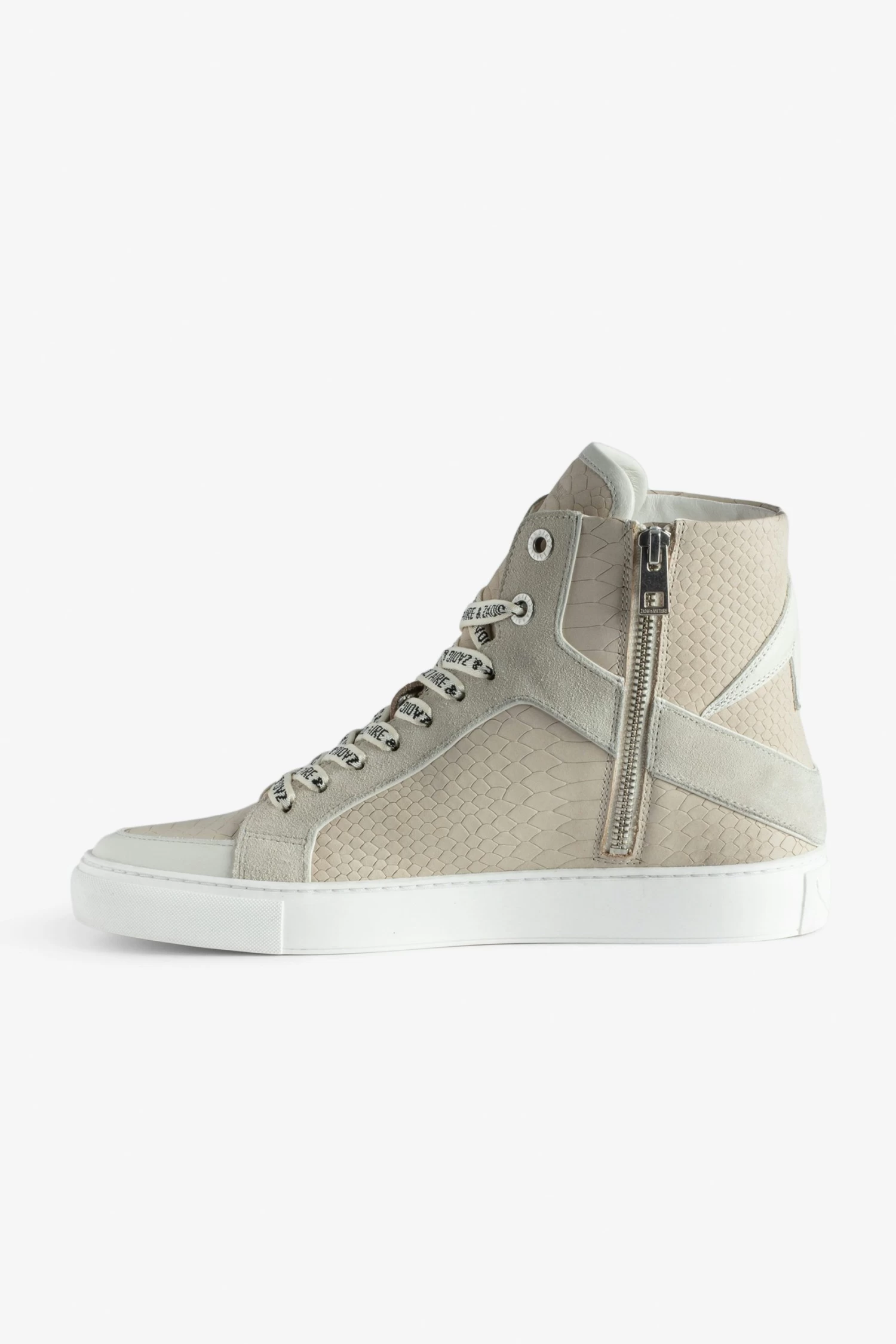 Now in snakeskin-effect leather, the Zadig&Voltaire signature ZV1747 high-top sneaker has been revamped in this new version with ZV-printed laces and a zip fastening on the inside. – Women’s Zadig&Voltaire ZV1747 high-top sneakers in smooth white leather – Beige snakeskin-effect leather – Flash overlays – ZV-printed laces – Inner zip fastening – ZV-printed tongue – Platform insole: 2.7 cm – Made in Portugal The Leather Working Group/LWG is a membership organization comprised of brands, suppliers, leather manufacturers and other stakeholders within the leather manufacturing industry. The group has developed an auditing program which certifies leather manufacturing facilities based on their environmental compliance and performance capabilities