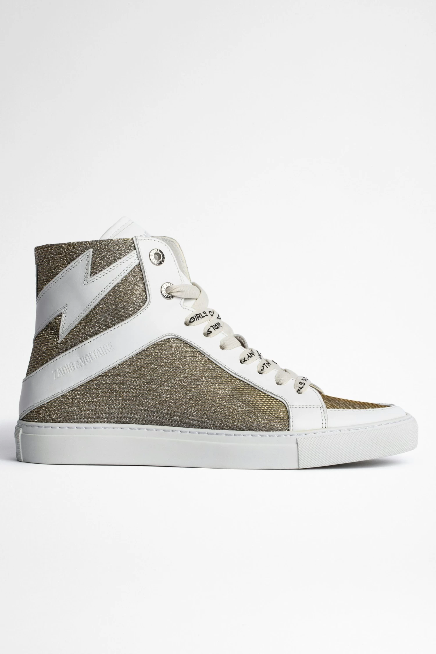 Minimalist and contemporary, the ZV1747 sneakers are a signature from the brand and they’re revisited each season with boldness and creativity. This high-top version in smooth white leather is decorated with glittery fabric panels and “Girls can do anything” laces. – Zadig&Voltaire ZV1747 women’s High Flash sneakers in smooth white leather and silver glittery fabric – Zadig&Voltaire embossed tongue – Zip closure on the inside – Lightning bolt patches in smooth white leather. – Made in Portugal.