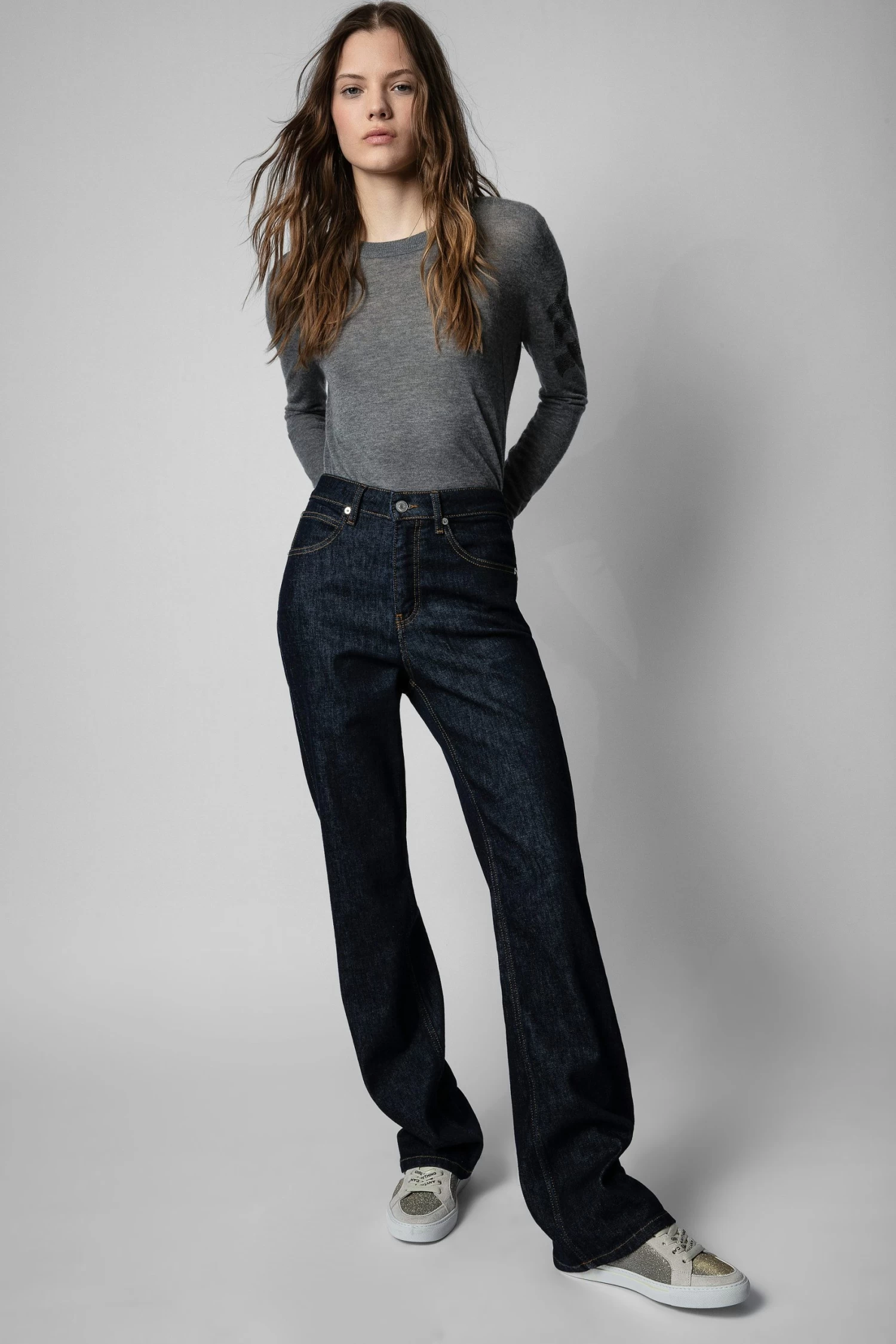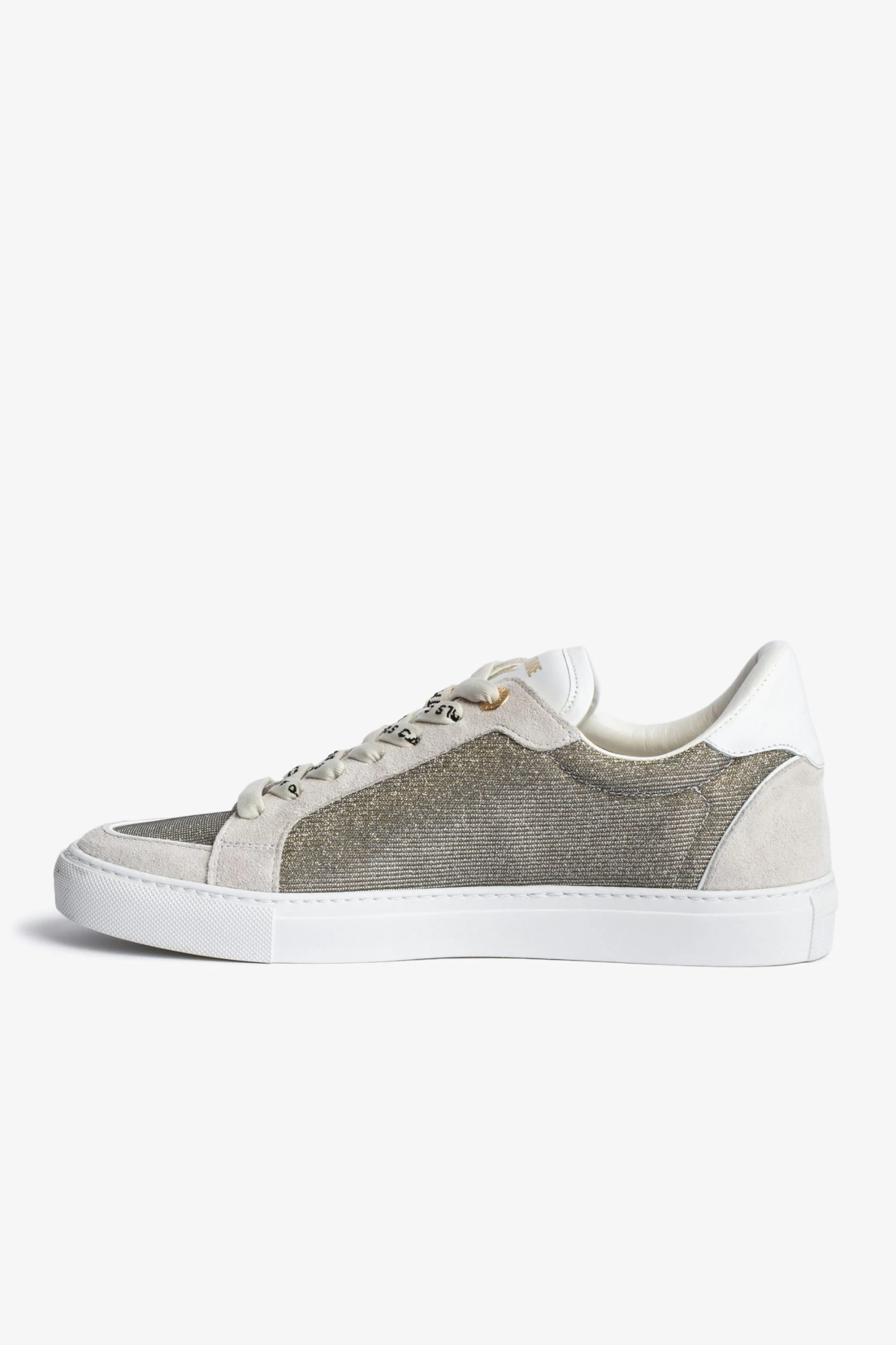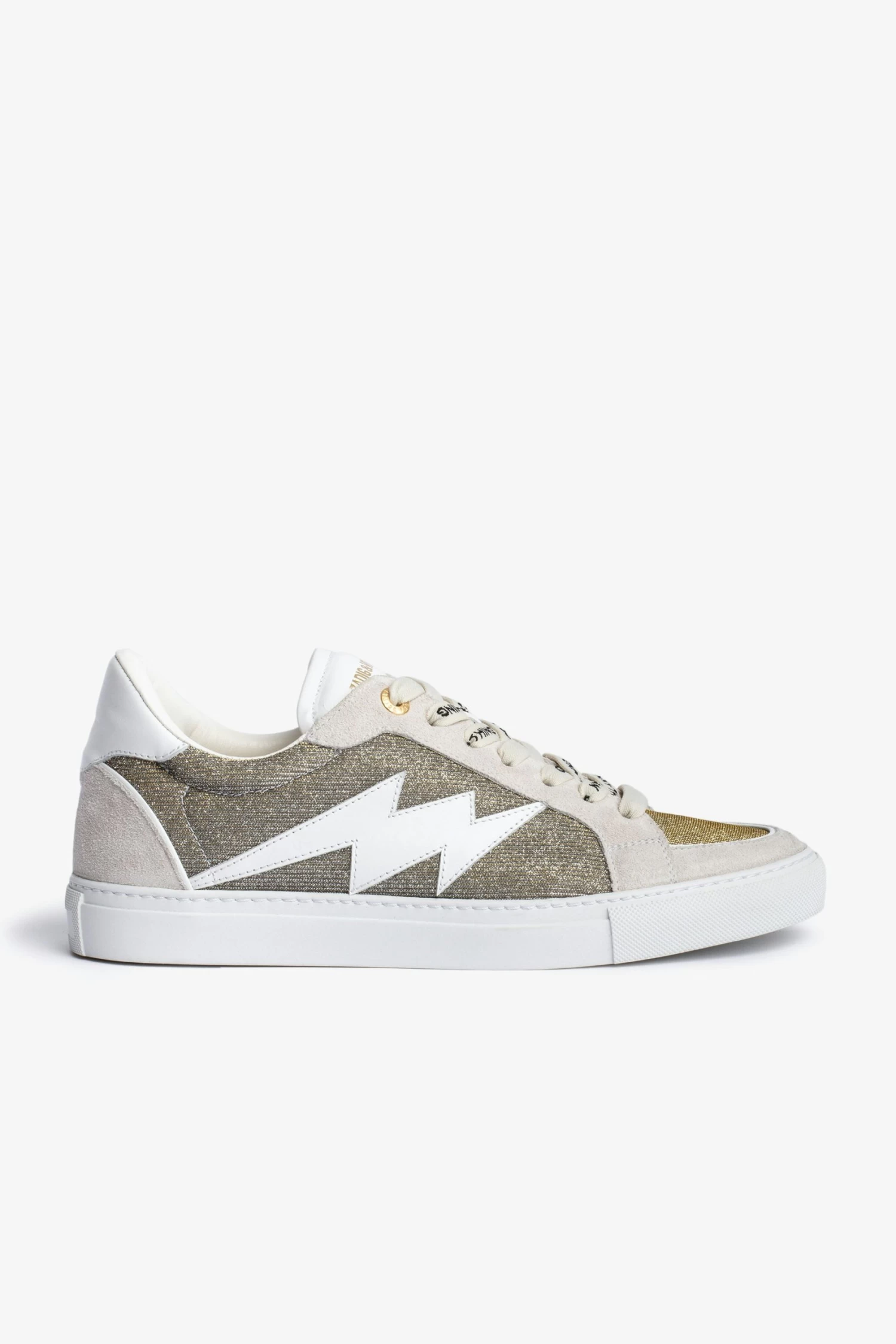 The brand’s iconic ZV1747 sneakers are available this season in smooth white suede, embellished with glittery fabric tabs, lightning bolt patches and “Girls Can Do Anything” laces. – Zadig&Voltaire women’s ZV1747 low-top sneakers in white leather and glittery fabric – Girls can do anything laces – Lightning bolt topstitching – Suede tabs – Made in Portugal.